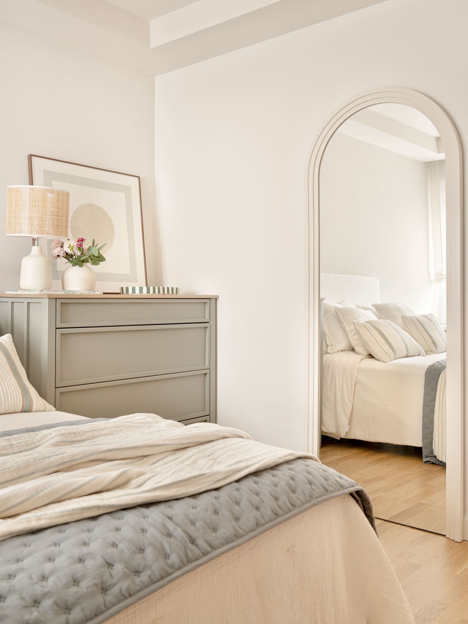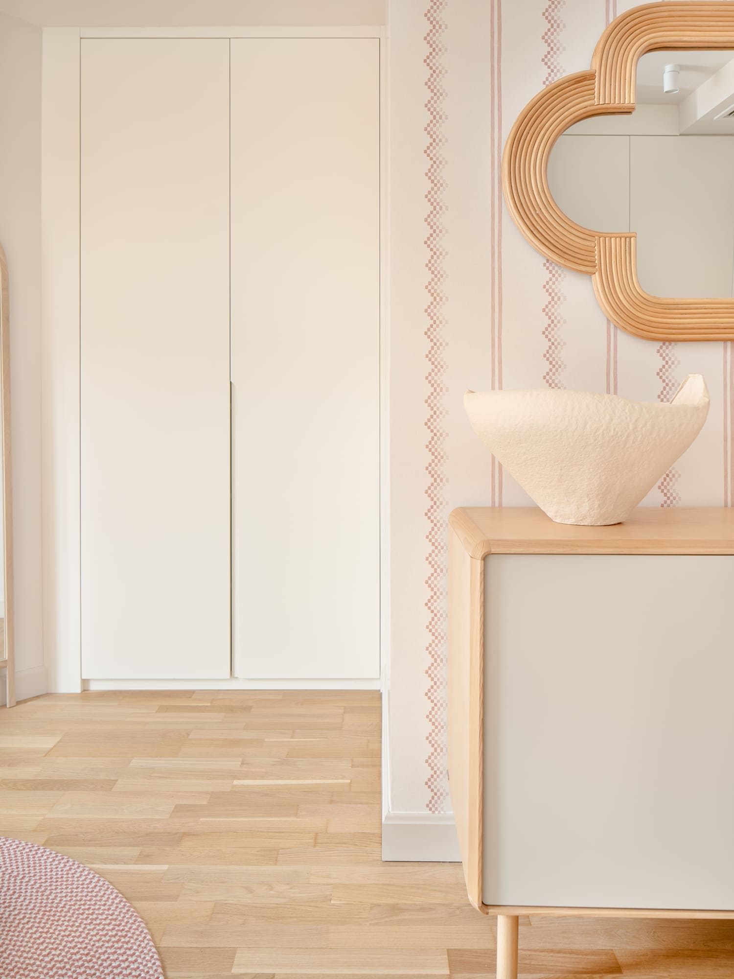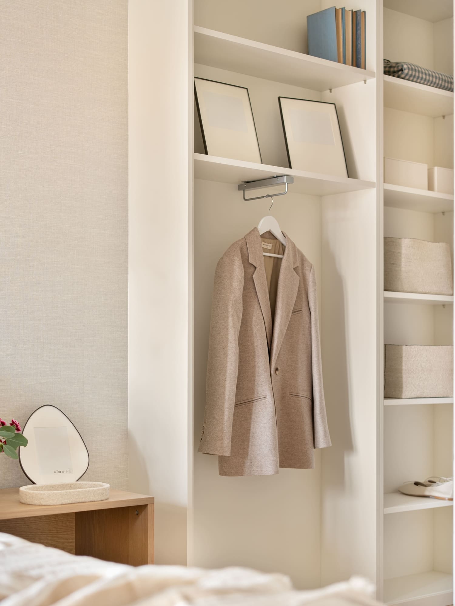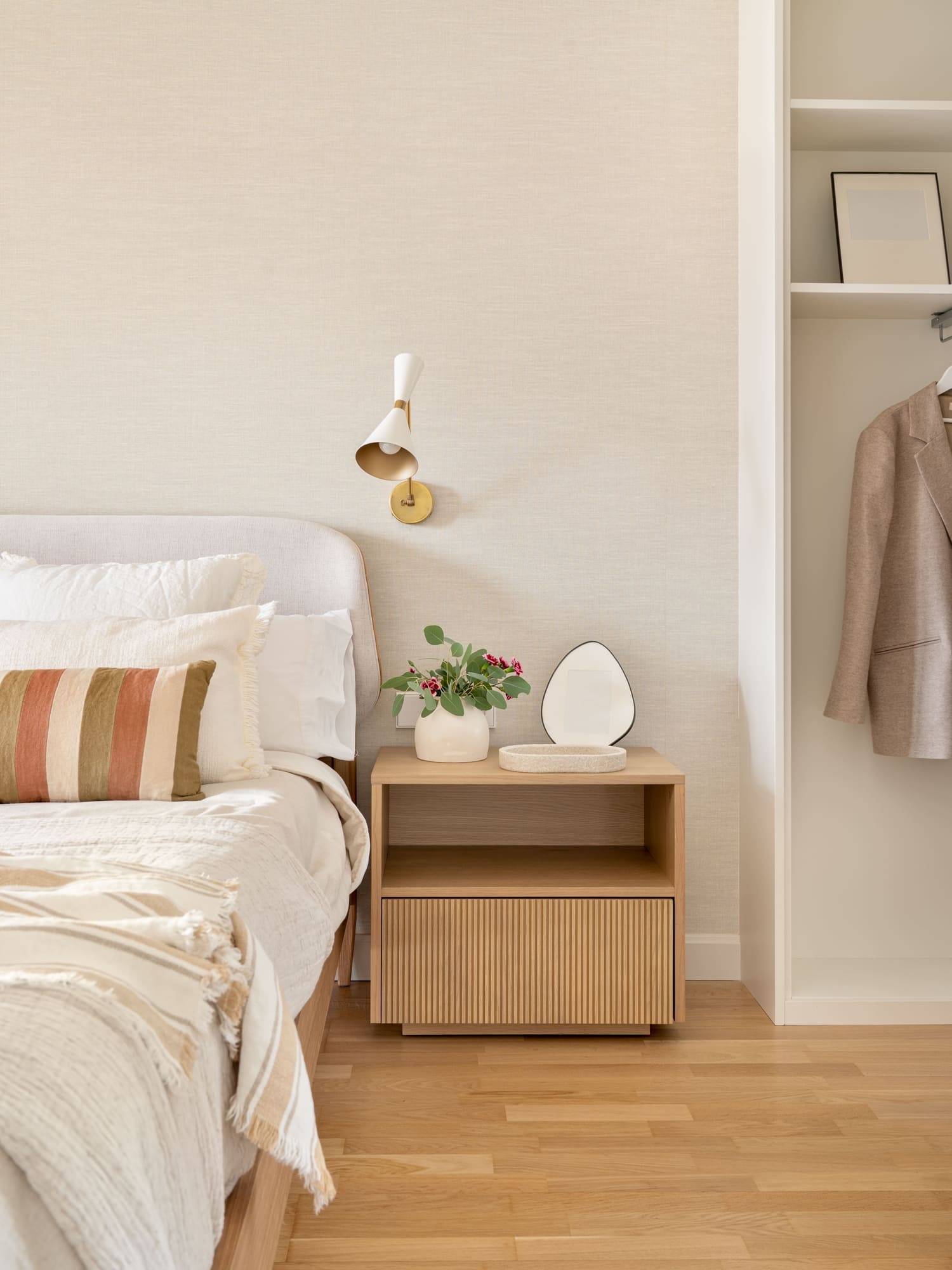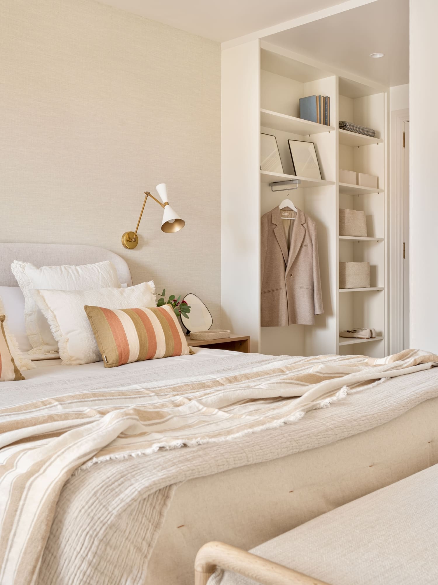 Una de sus prioridades era contar con un vestidor cerrado, además de ampliar la capacidad de almacenaje en su dormitorio. Diseñamos todos los armarios a medida, estudiando proporciones, alturas y necesidades reales, para lograr soluciones que respiran ligereza pese a su funcionalidad. En el dormitorio principal combinamos almacenaje abierto y cerrado, integrando las piezas en una envolvente cálida de tonos neutros y tejidos naturales.