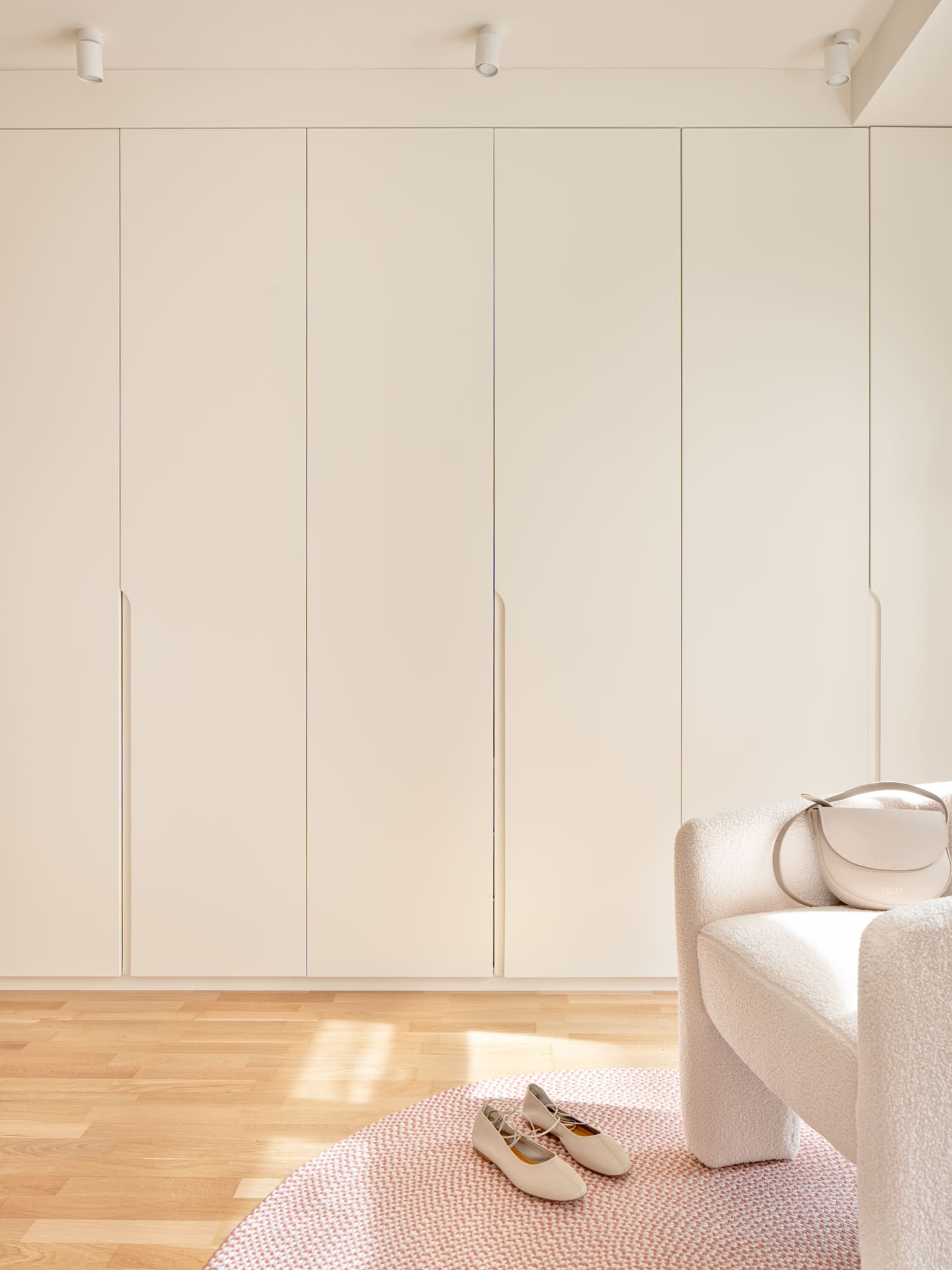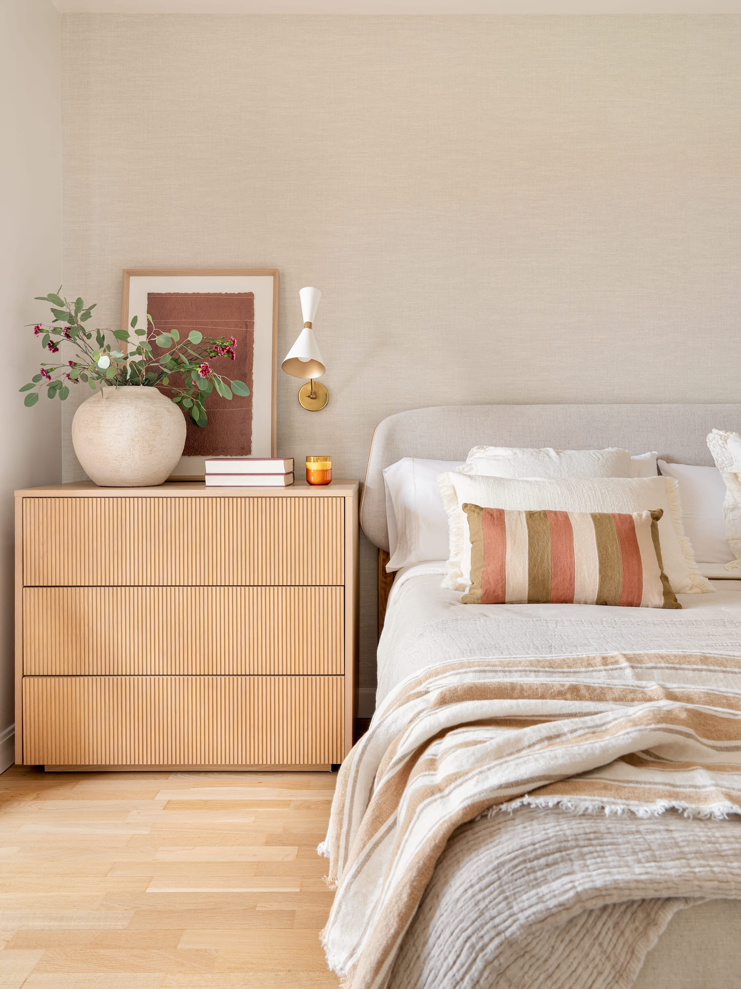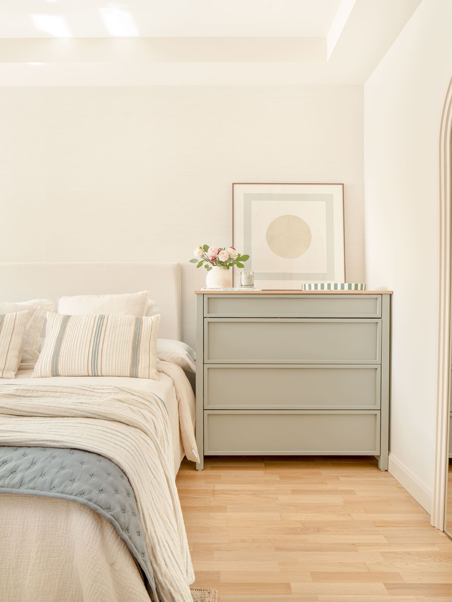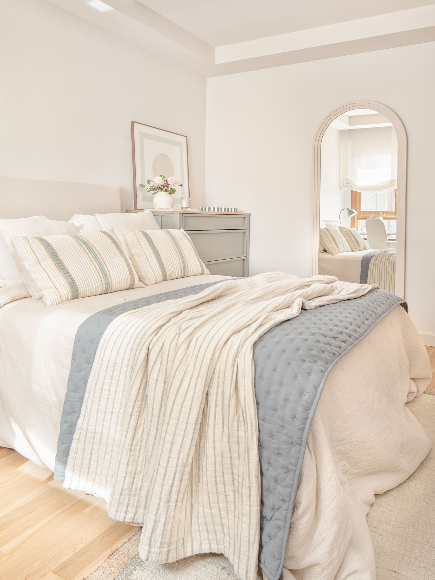 Una de sus prioridades era contar con un vestidor cerrado, además de ampliar la capacidad de almacenaje en su dormitorio. Diseñamos todos los armarios a medida, estudiando proporciones, alturas y necesidades reales, para lograr soluciones que respiran ligereza pese a su funcionalidad. En el dormitorio principal combinamos almacenaje abierto y cerrado, integrando las piezas en una envolvente cálida de tonos neutros y tejidos naturales.