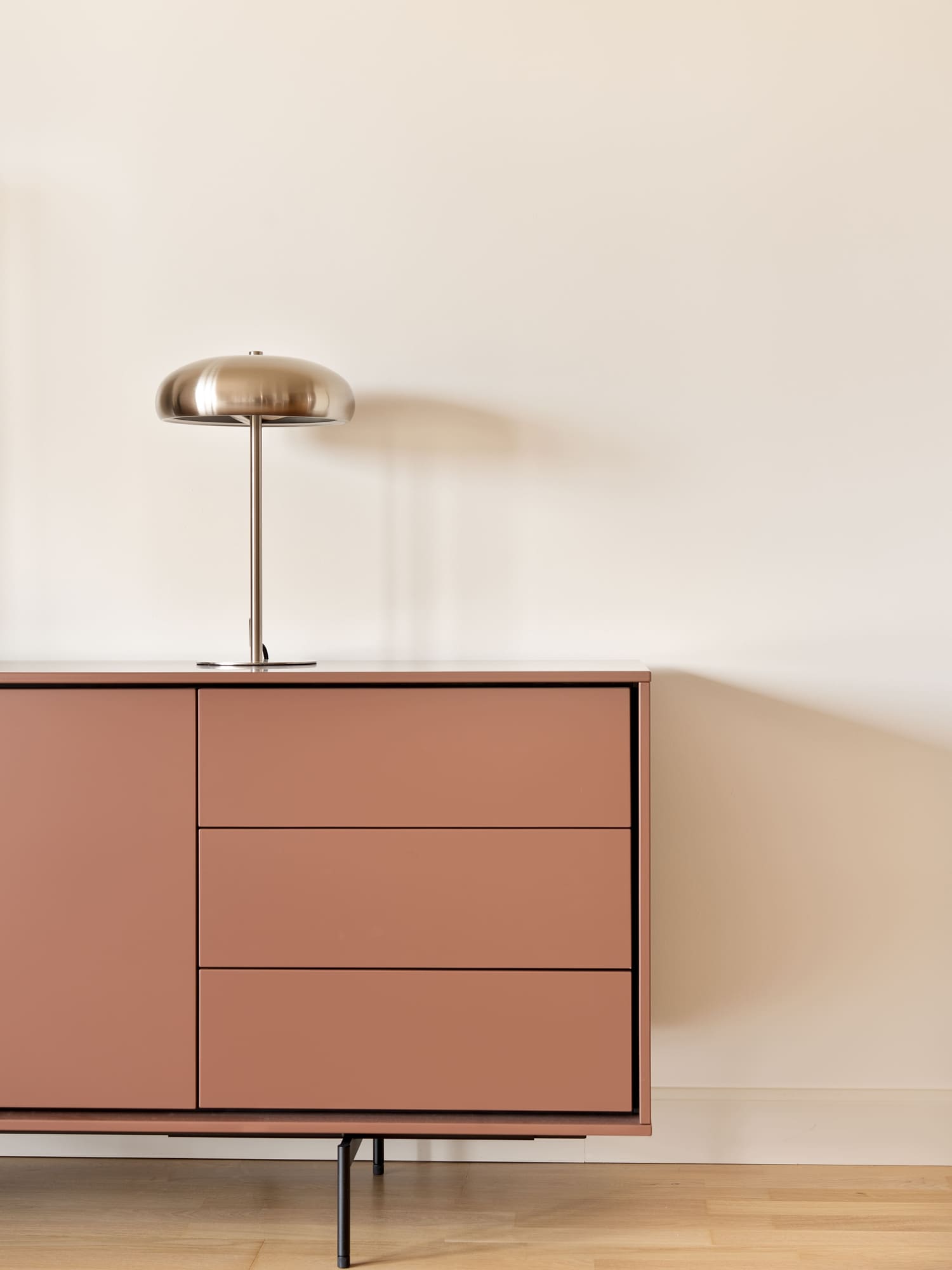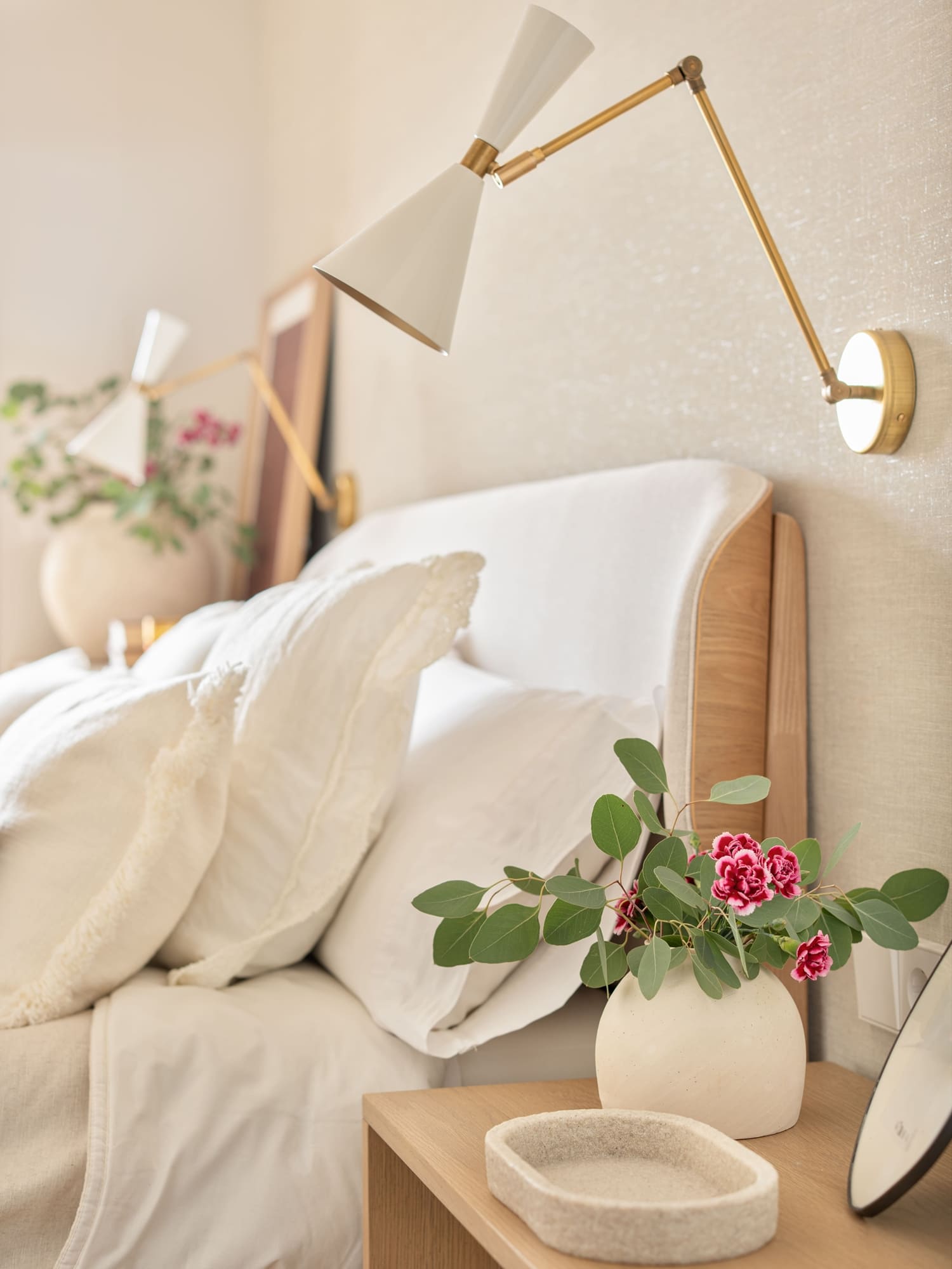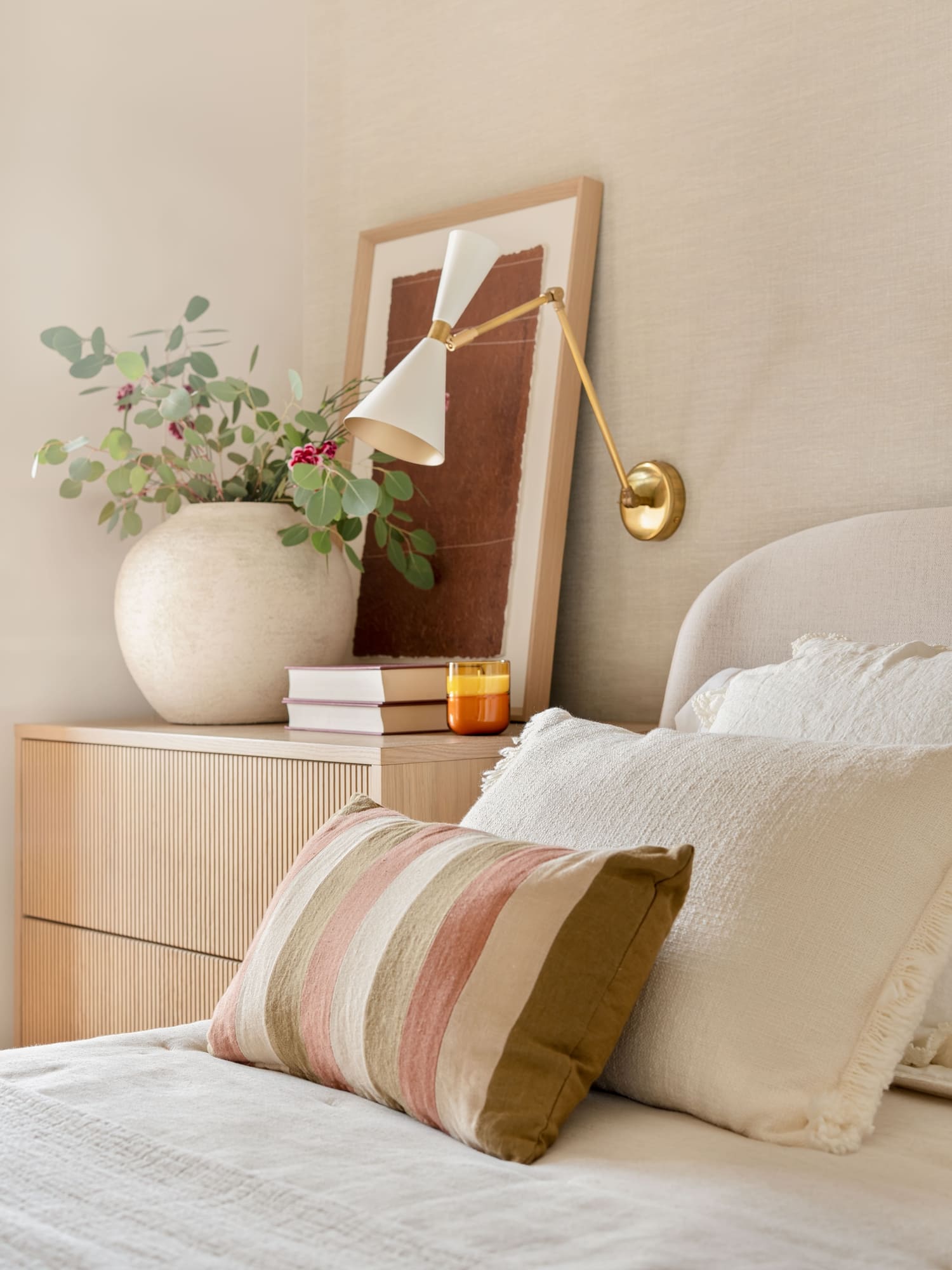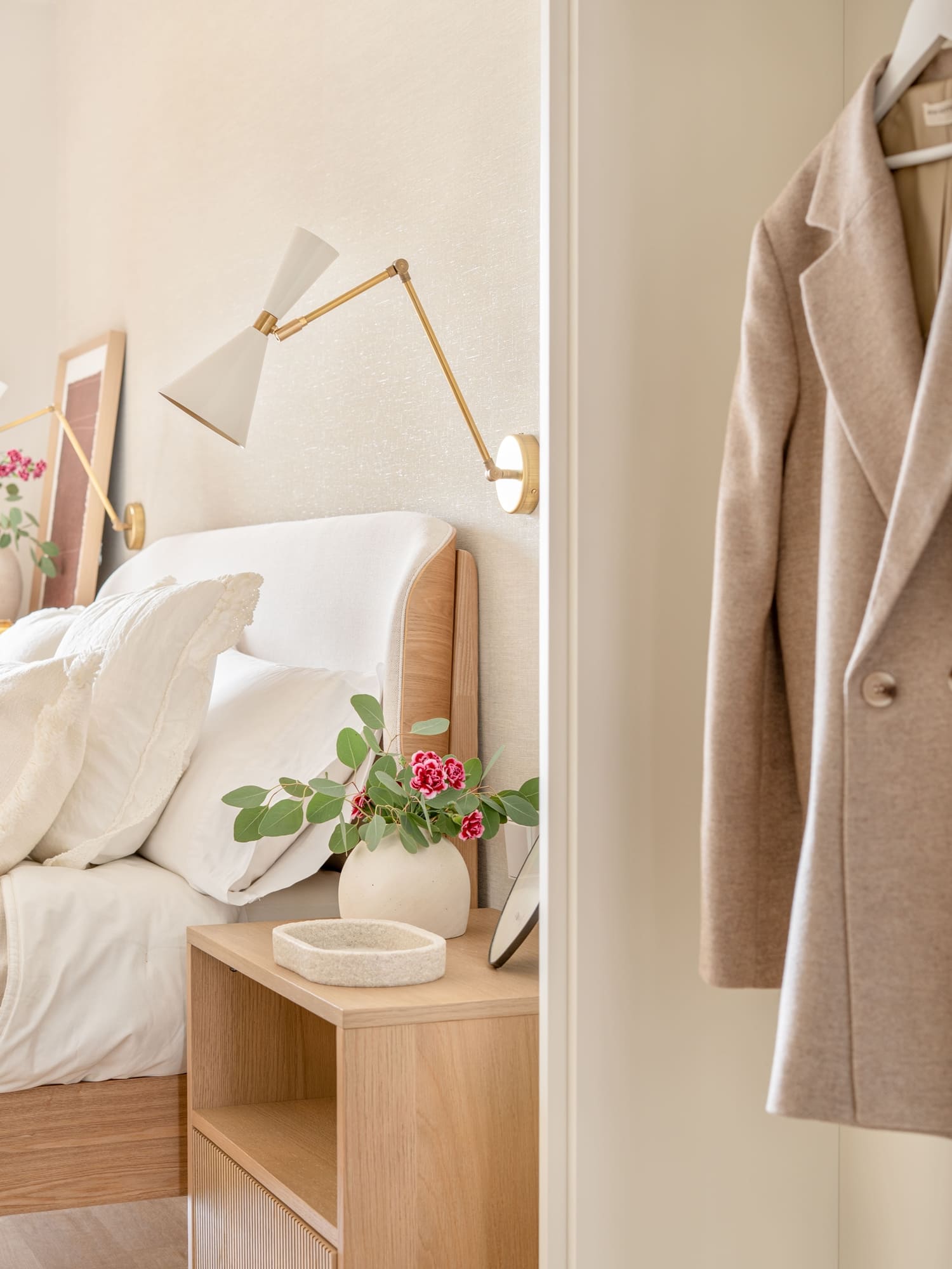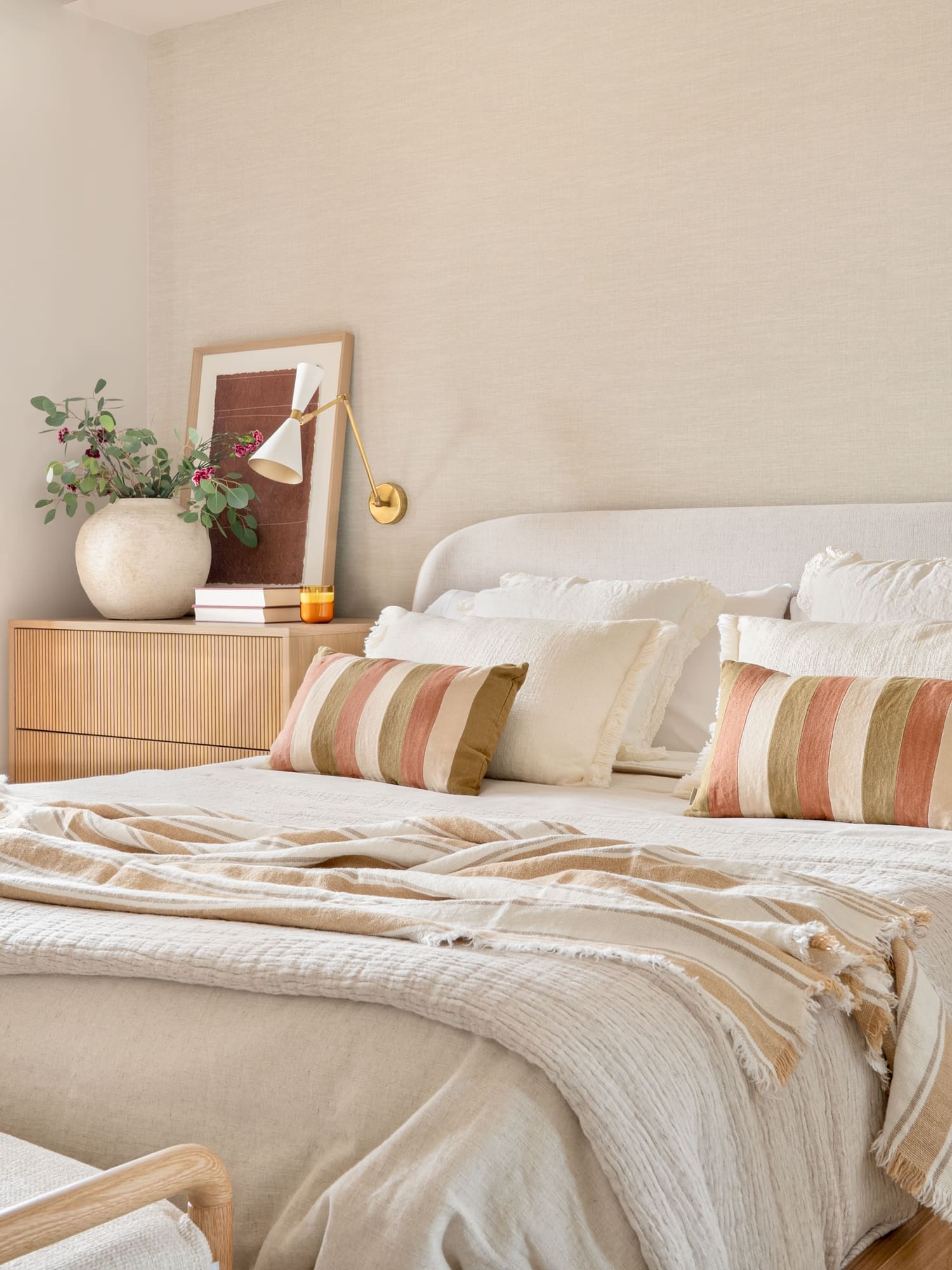 Una de sus prioridades era contar con un vestidor cerrado, además de ampliar la capacidad de almacenaje en su dormitorio. Diseñamos todos los armarios a medida, estudiando proporciones, alturas y necesidades reales, para lograr soluciones que respiran ligereza pese a su funcionalidad. En el dormitorio principal combinamos almacenaje abierto y cerrado, integrando las piezas en una envolvente cálida de tonos neutros y tejidos naturales.