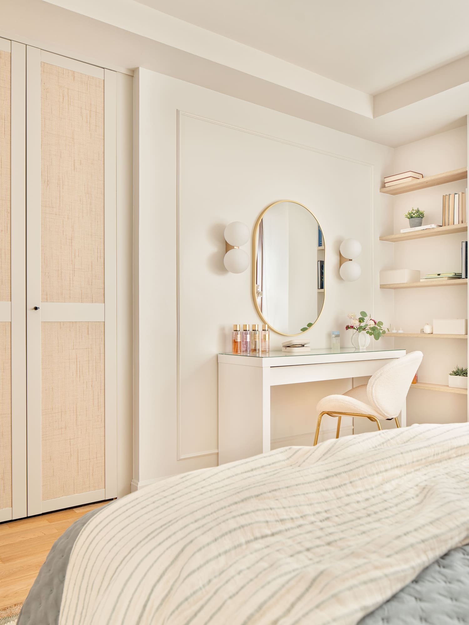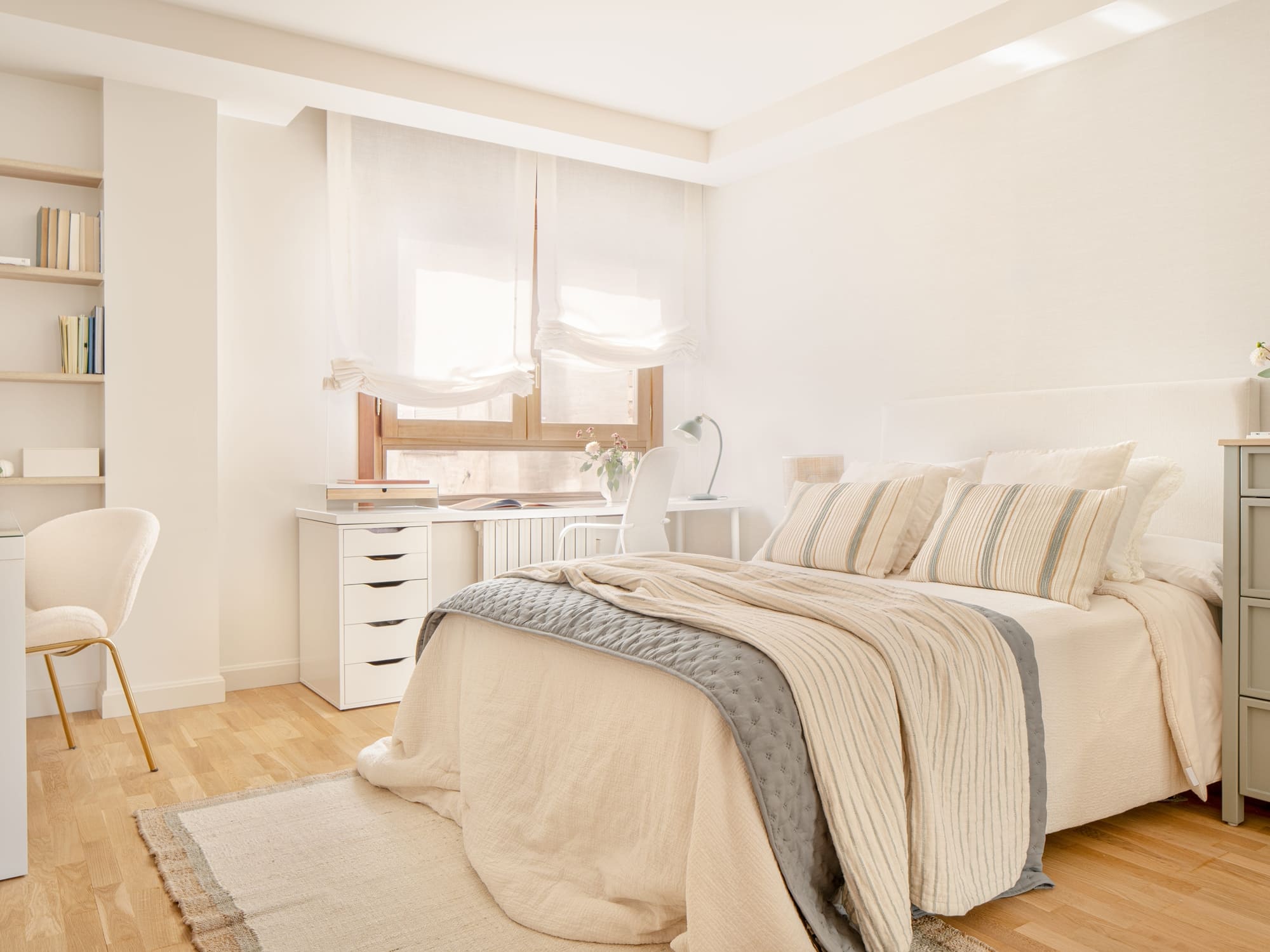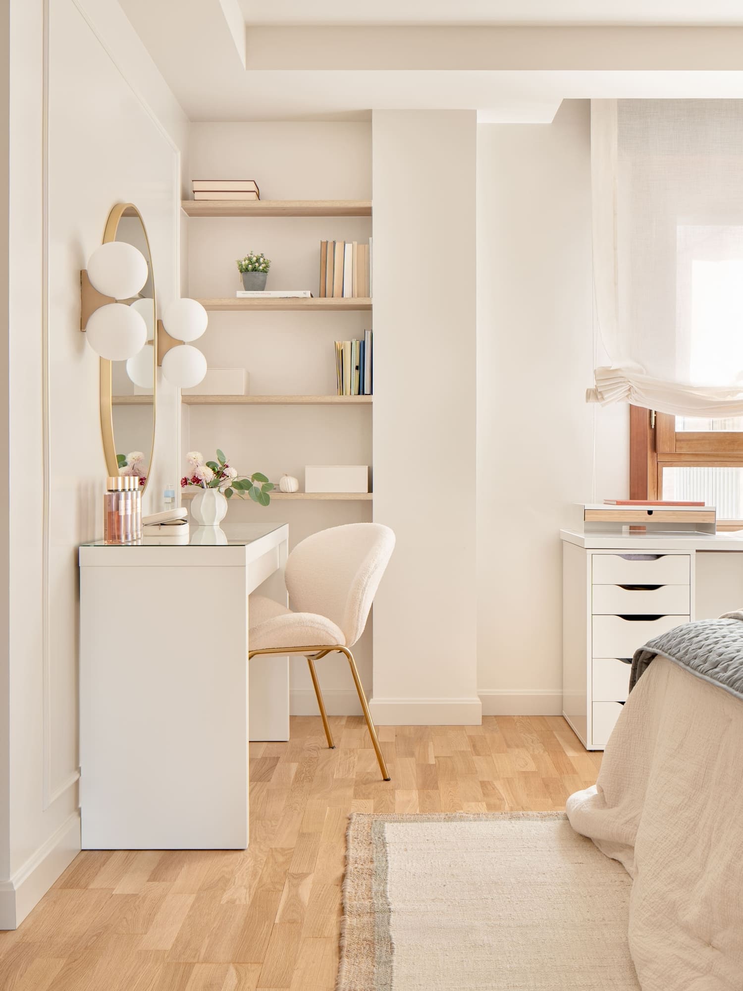 El dormitorio de su hija se planteó como un espacio versátil, con zona de descanso, área de trabajo y un pequeño tocador. Cada rincón se diseñó con intención, buscando que creciera con ella y mantuviera siempre una sensación amable y luminosa.