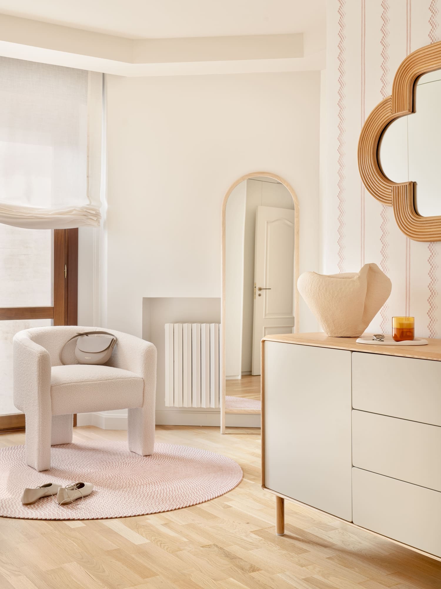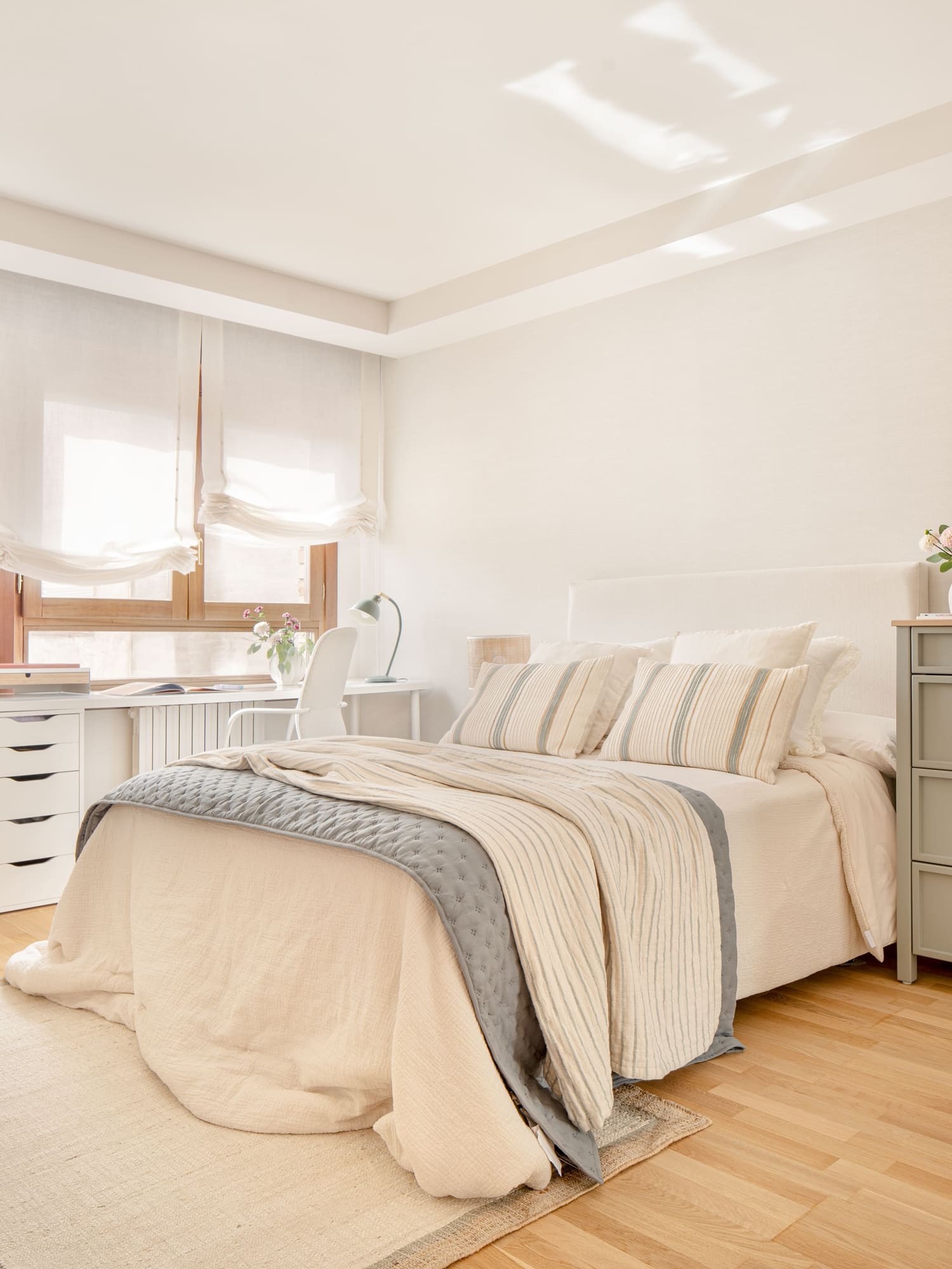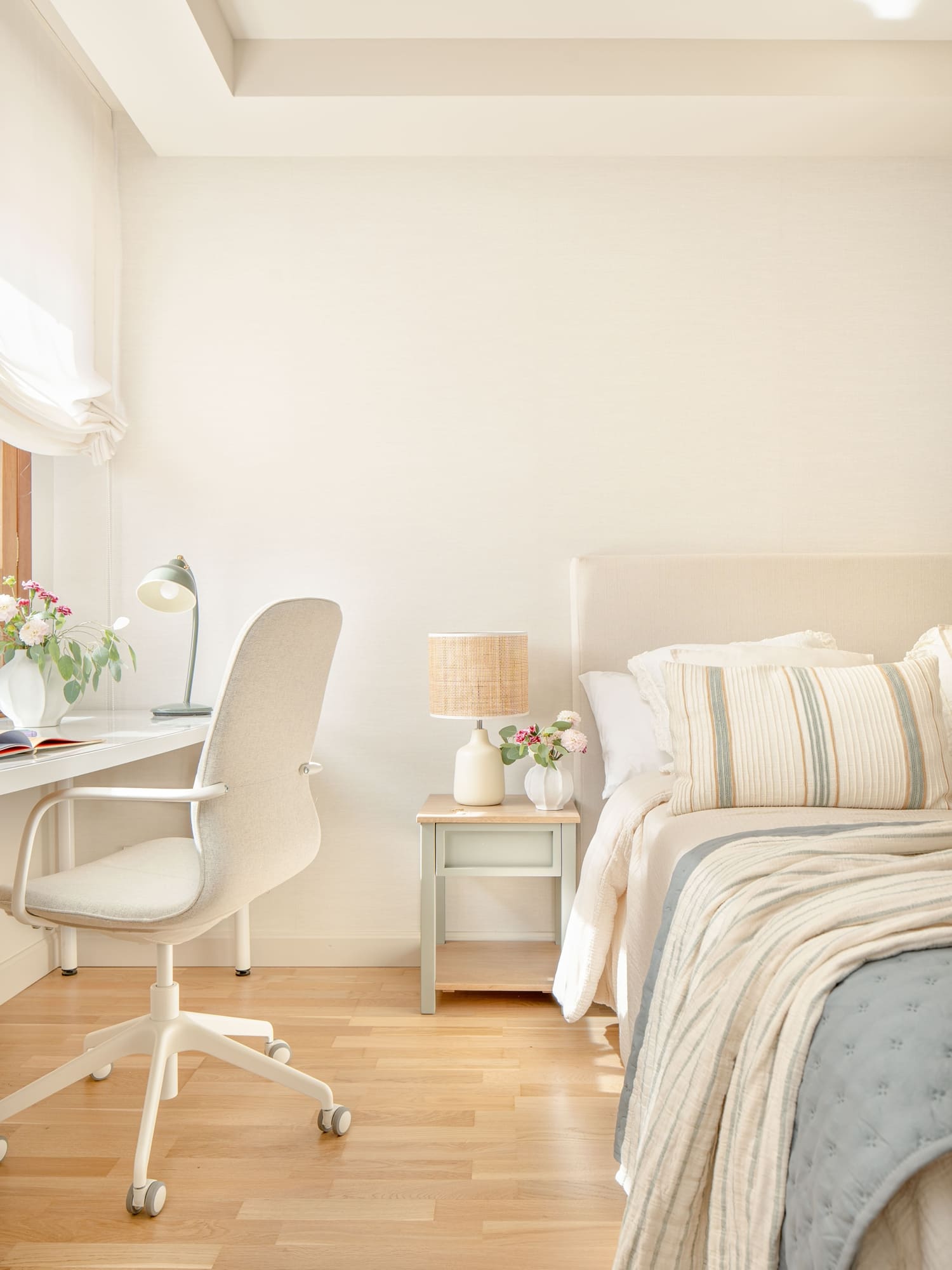 El dormitorio de su hija se planteó como un espacio versátil, con zona de descanso, área de trabajo y un pequeño tocador. Cada rincón se diseñó con intención, buscando que creciera con ella y mantuviera siempre una sensación amable y luminosa.