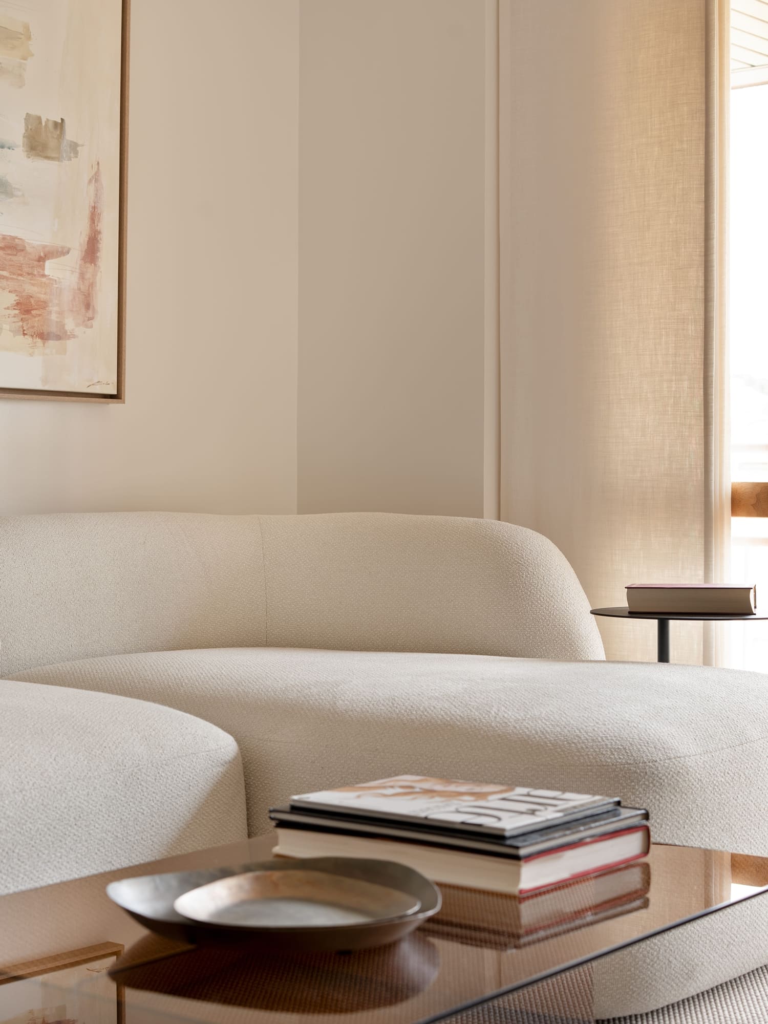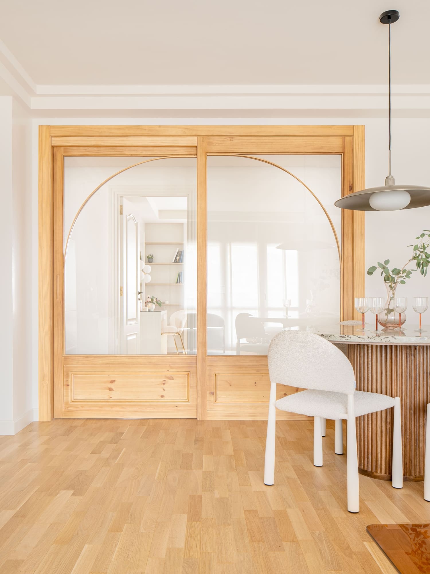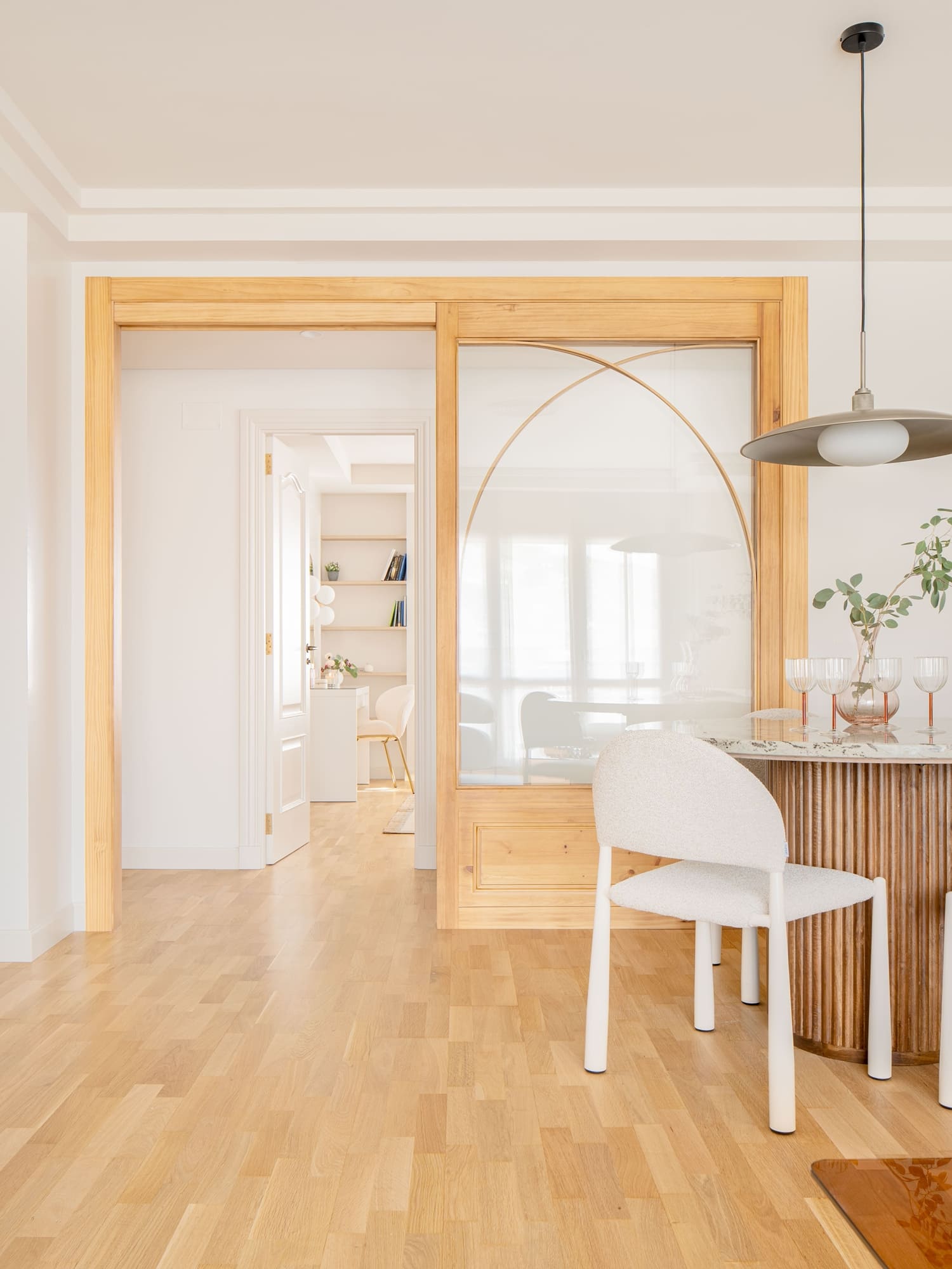 En el salón, la clienta quería conservar su independencia respecto a otras estancias, pero sin renunciar al paso de luz natural. Para ello diseñamos una gran puerta corredera de madera con curvas suaves, que permite separar sin aislar y se convierte en una pieza protagonista del proyecto.