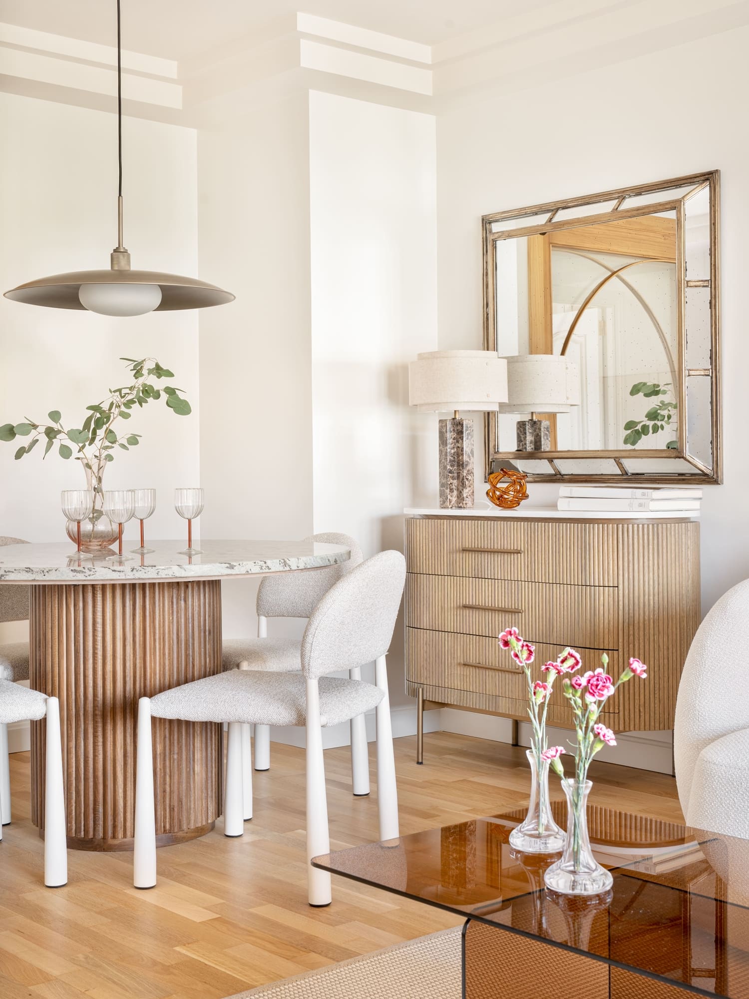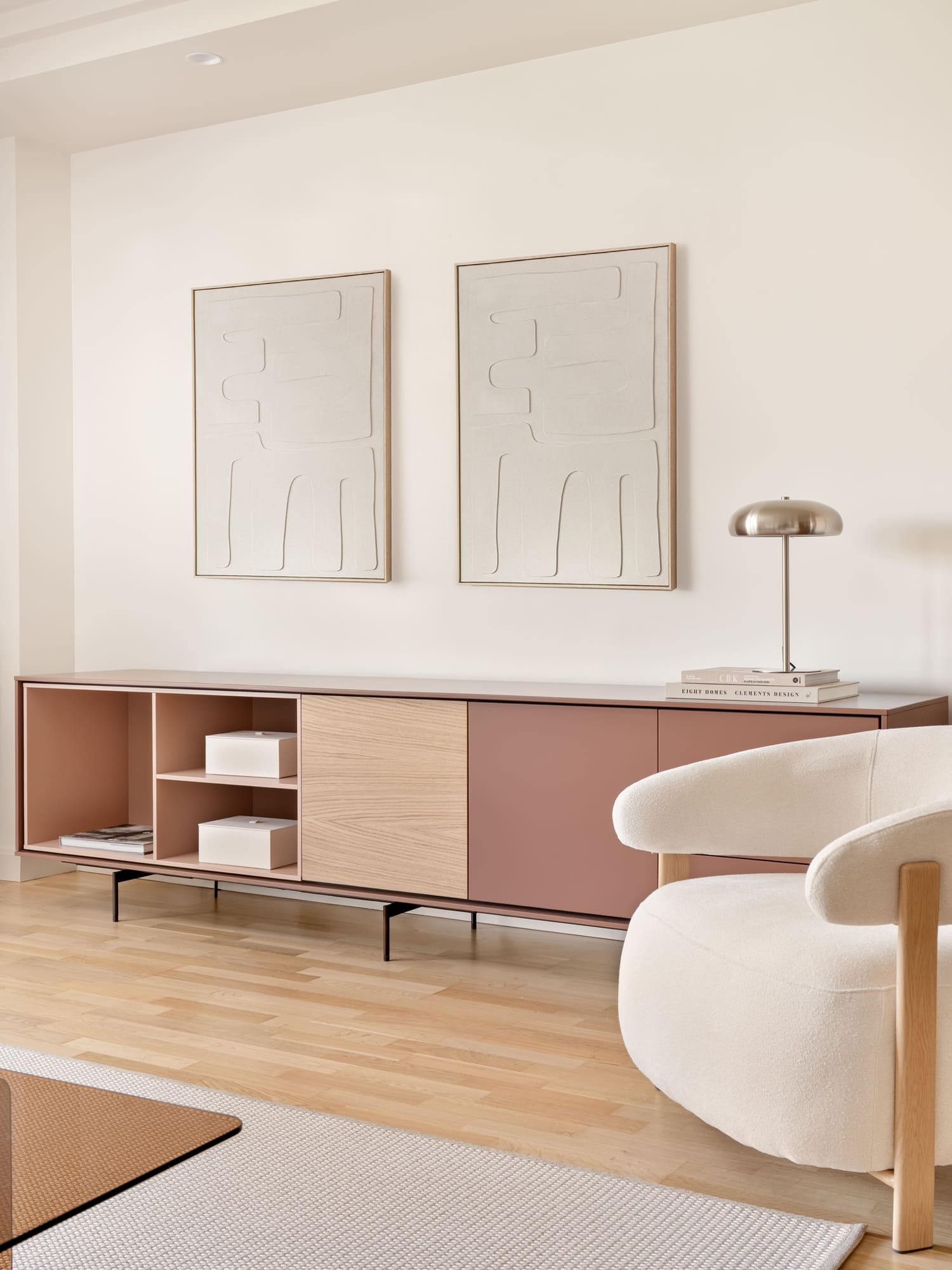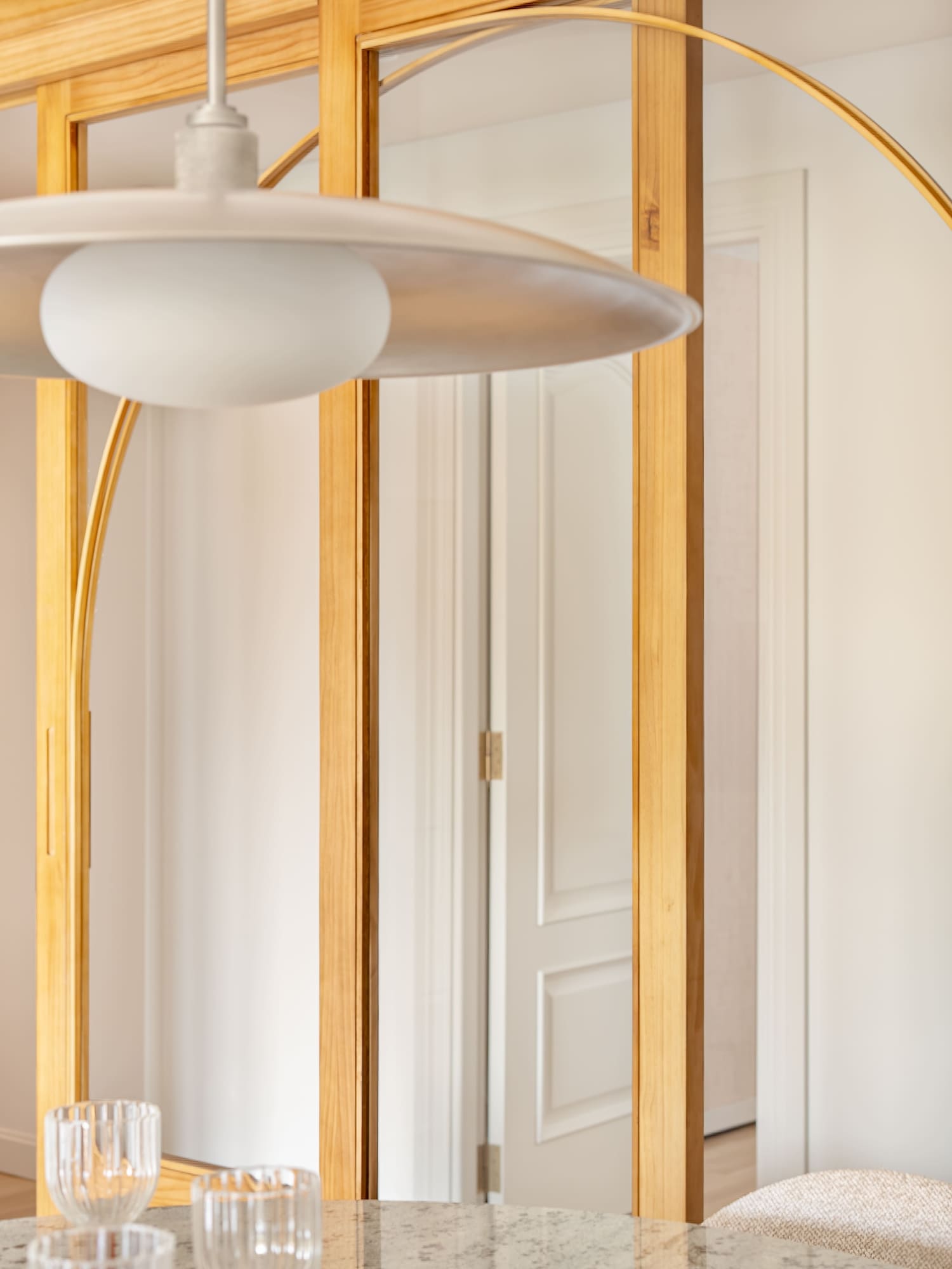 En el salón, la clienta quería conservar su independencia respecto a otras estancias, pero sin renunciar al paso de luz natural. Para ello diseñamos una gran puerta corredera de madera con curvas suaves, que permite separar sin aislar y se convierte en una pieza protagonista del proyecto.