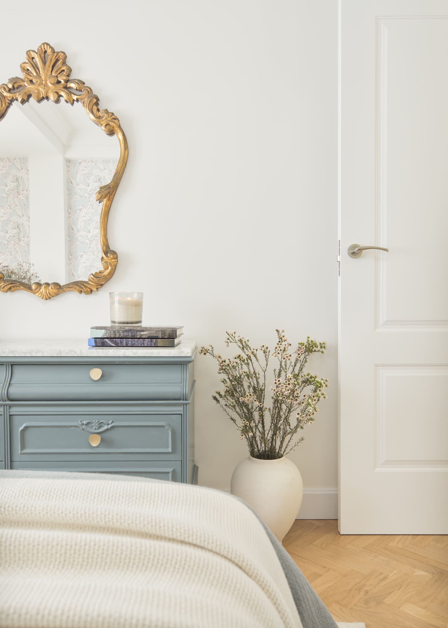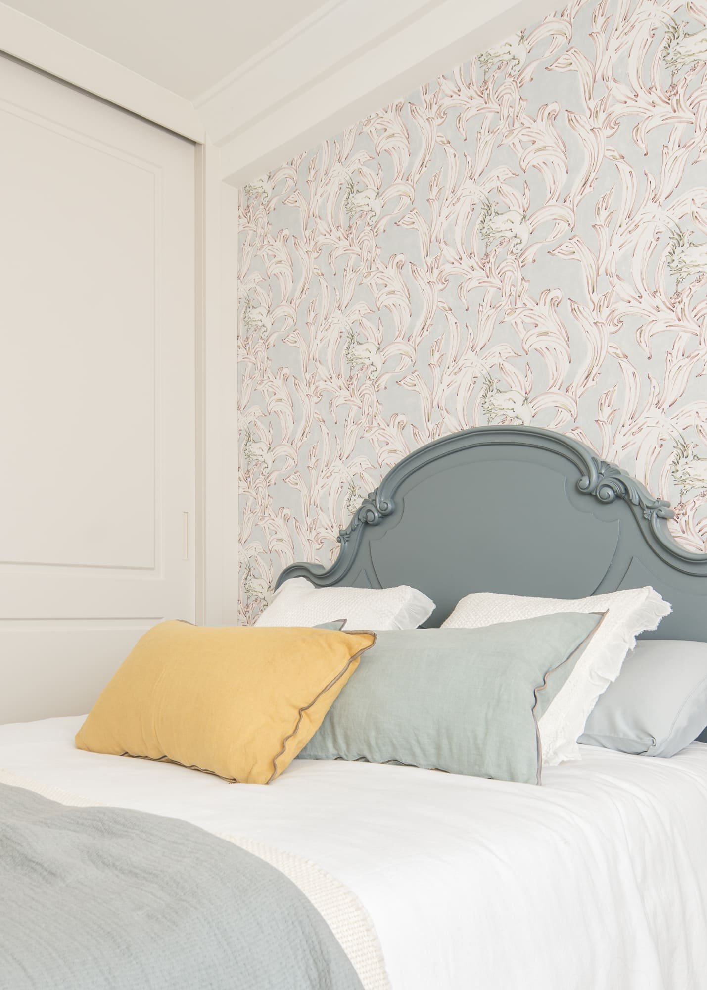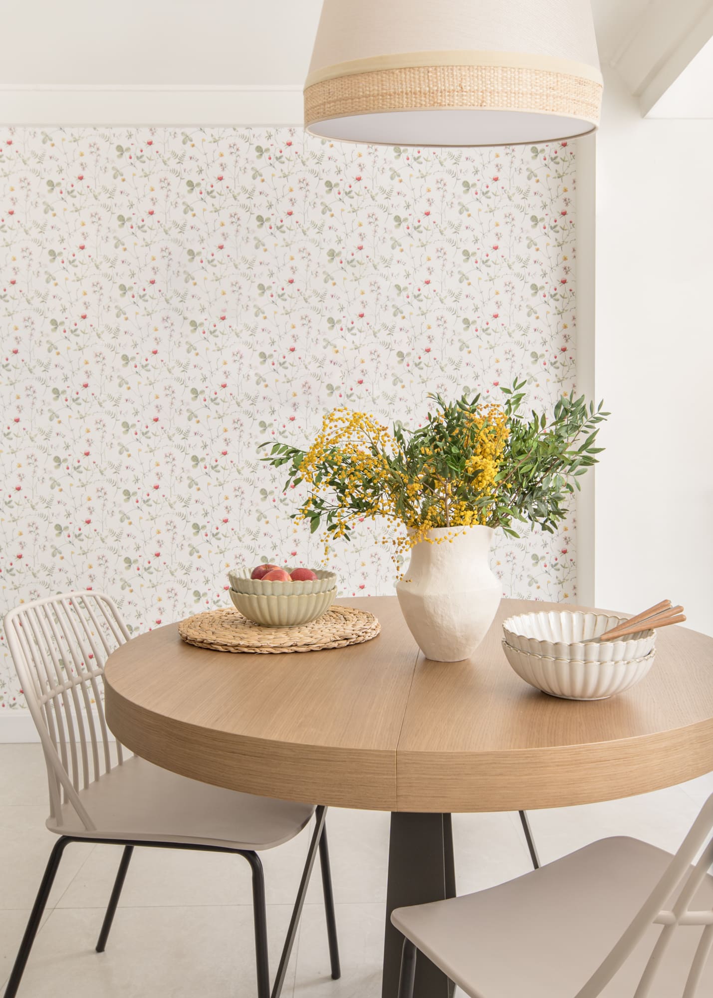 El papel pintado aporta personalidad y un punto decorativo sutil, introduciendo un lenguaje delicado que acompaña sin imponerse. Este recurso, combinado con molduras, carpinterías cuidadas y una selección de mobiliario de líneas suaves, ayuda a crear espacios con identidad propia pero conectados entre sí.