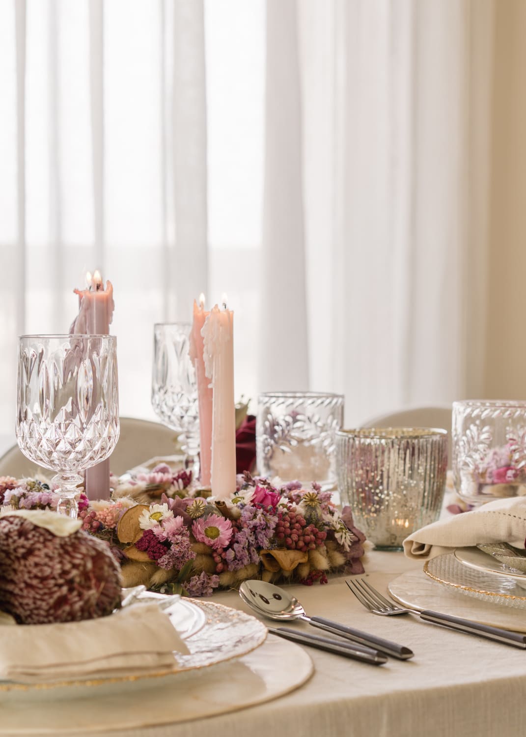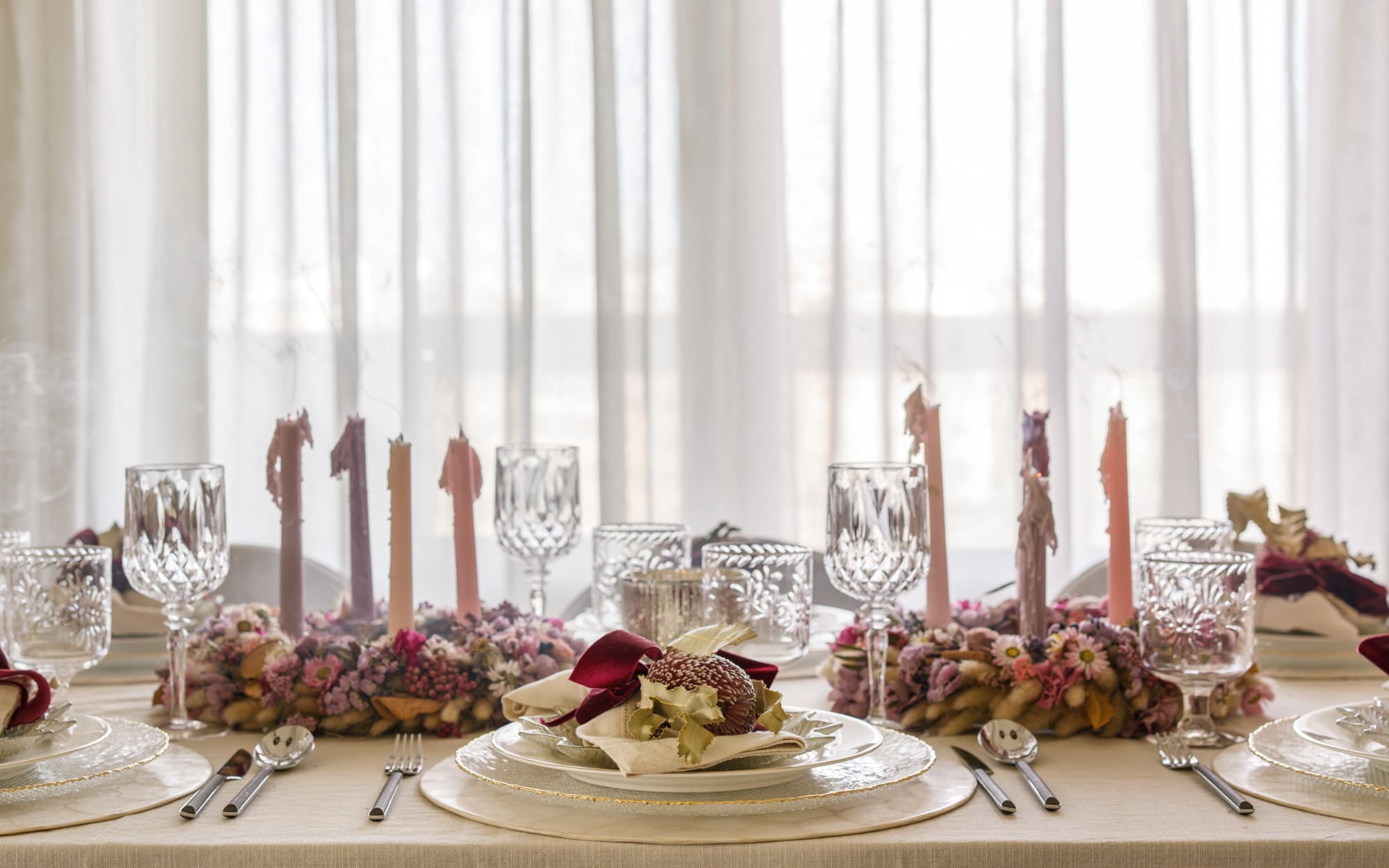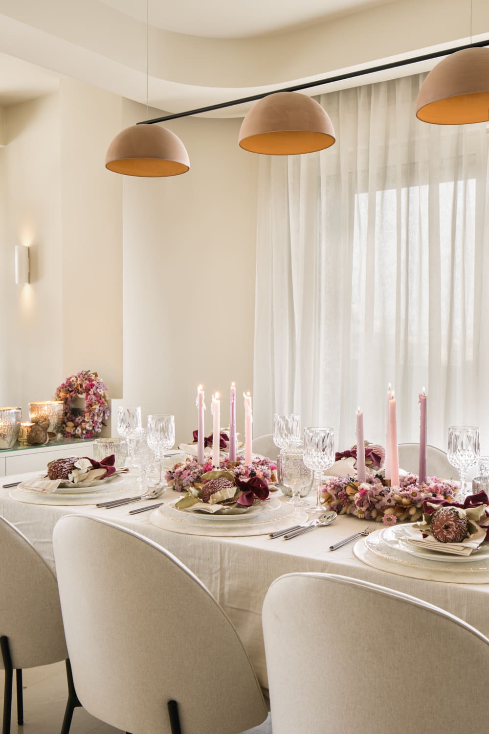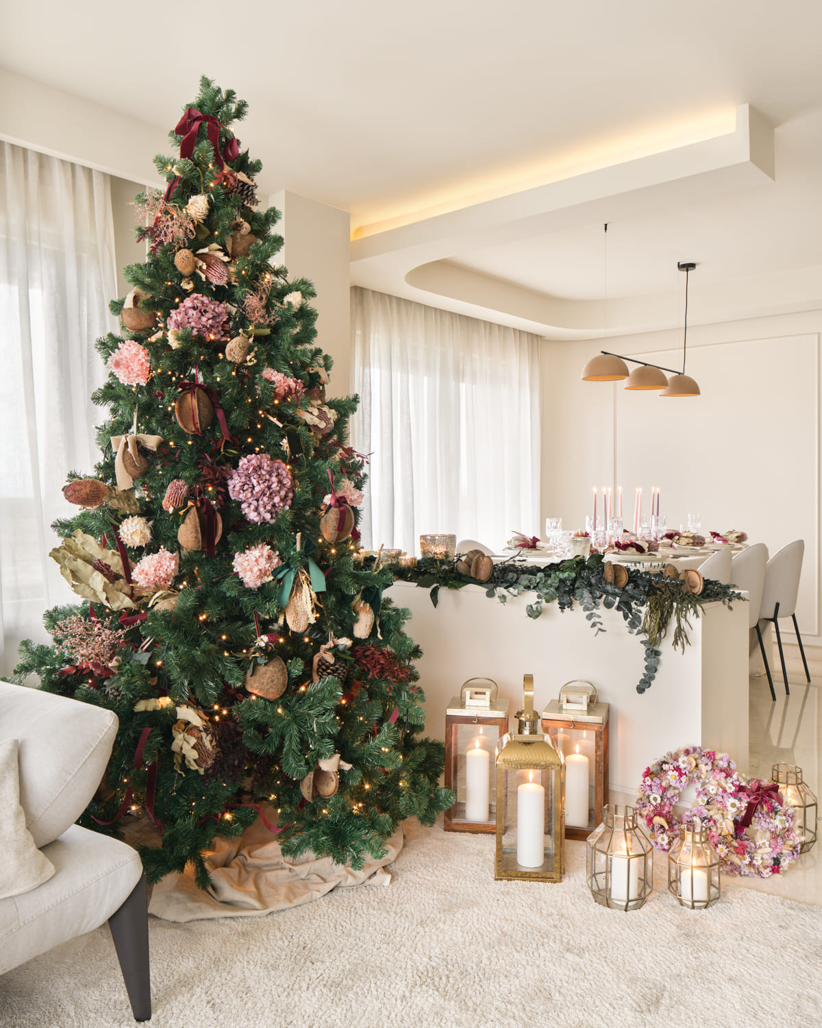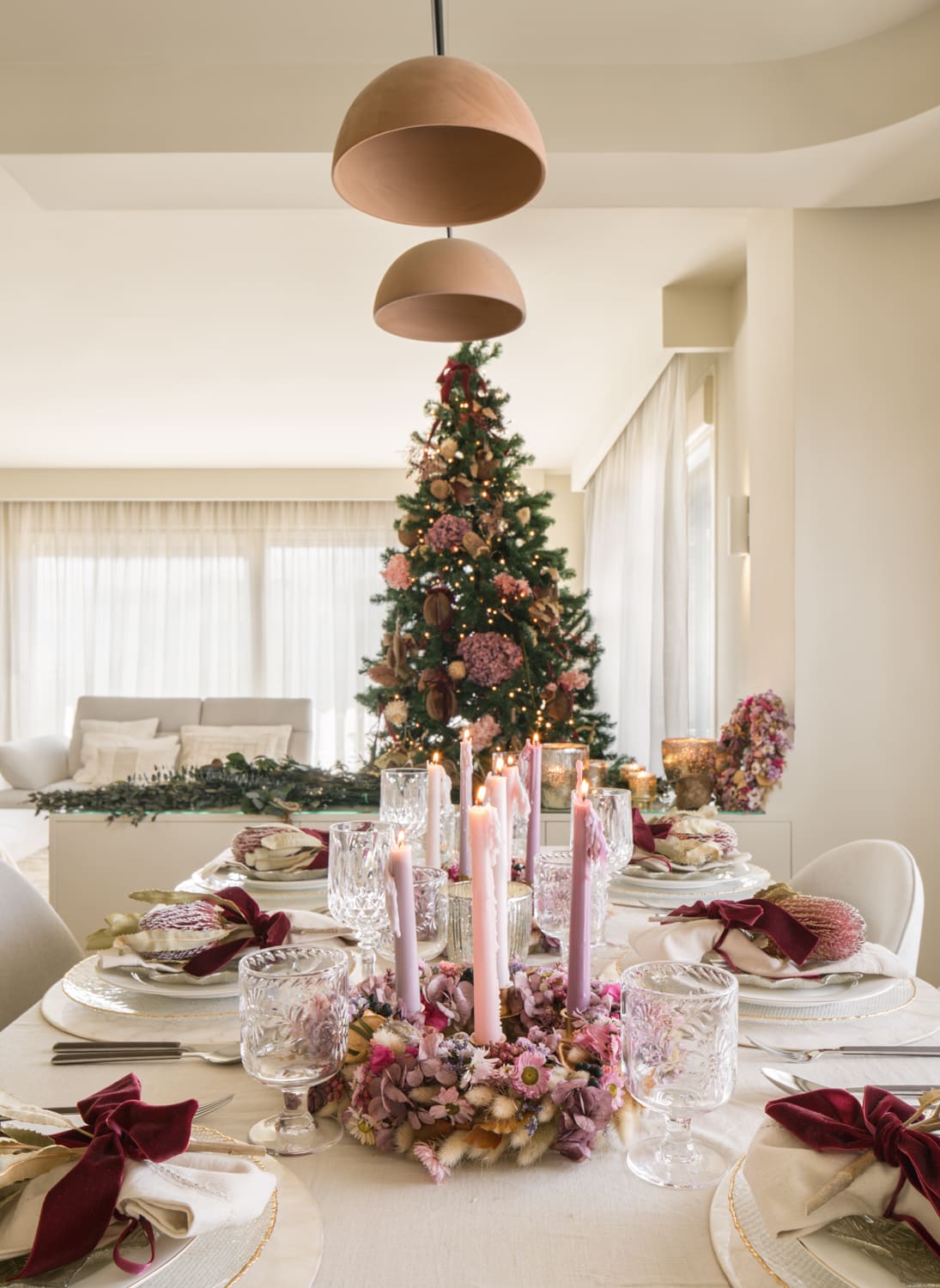La primera propuesta giraba en torno a los tonos rosas y lilas, presentes tanto en la mesa como en el árbol. Cuando Paula me contó que una de las coronas de la colección se inspiraba en el origen de la corona de Adviento —con tres velas lilas y una rosa— lo tuvimos claro: era el punto de partida perfecto para una Navidad diferente, delicada y muy luminosa. La combinamos con servilleteros de flor tropical preservada y un árbol decorado con hortensias y cocos que aportan ese aire cálido y artesanal tan característico de su trabajo.