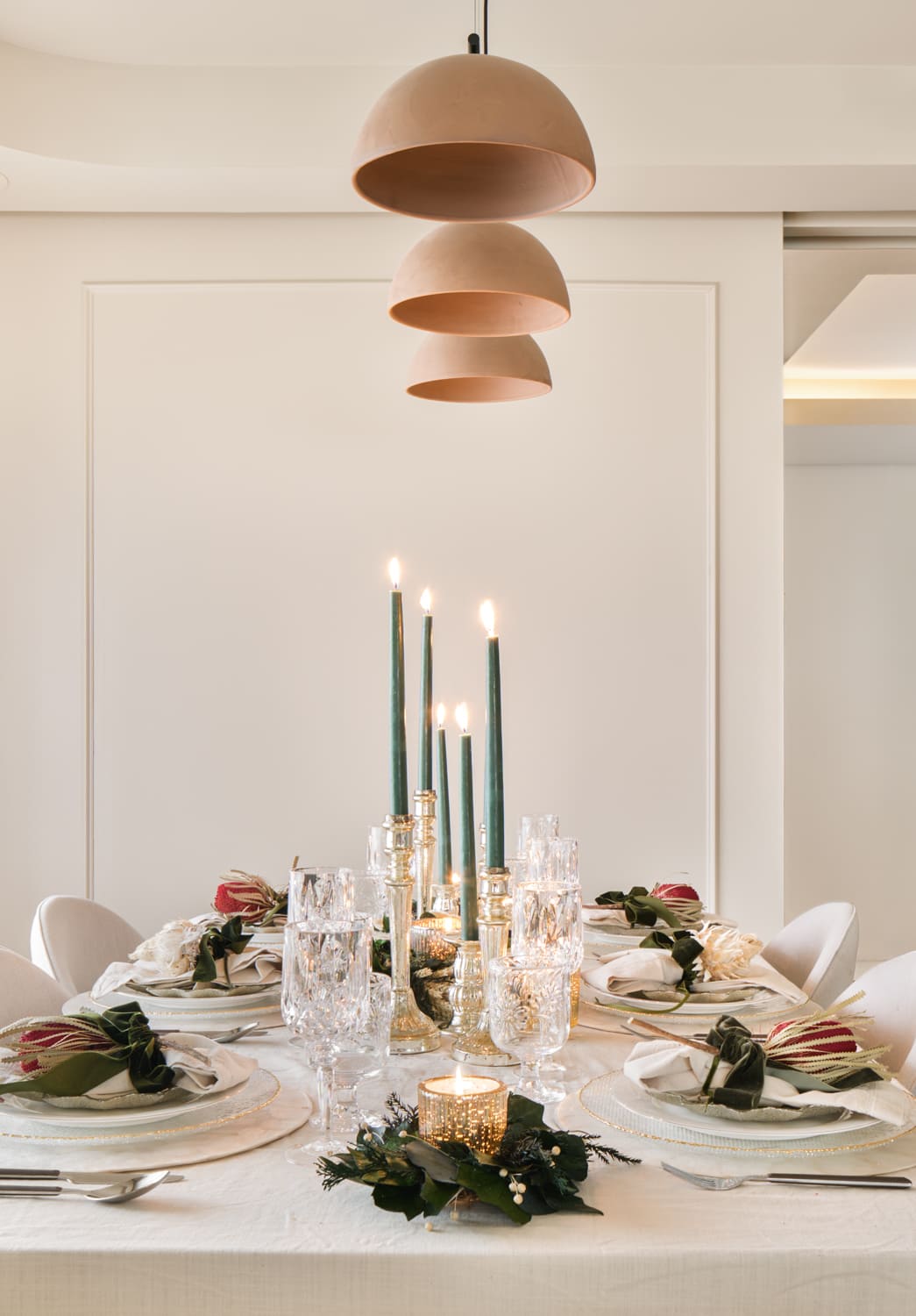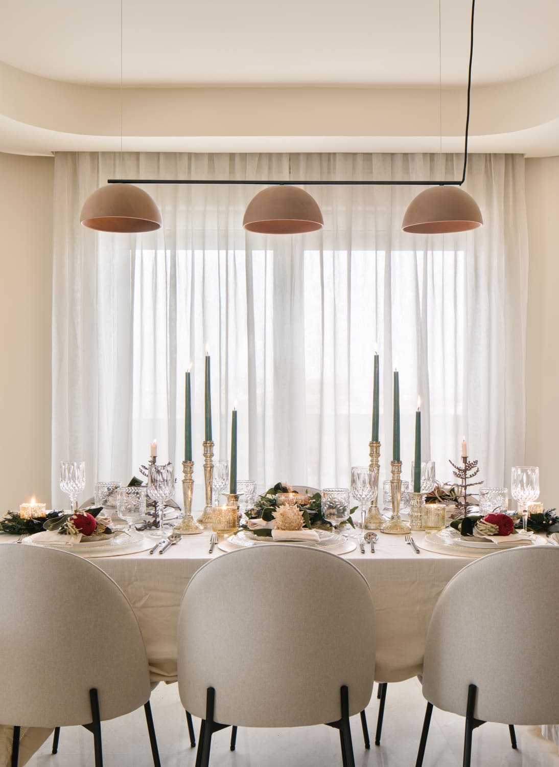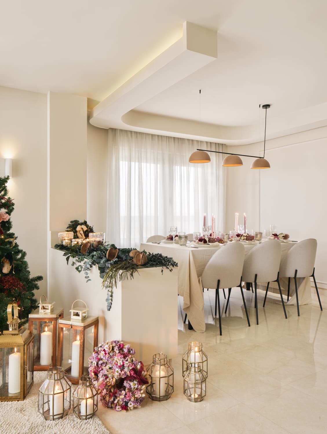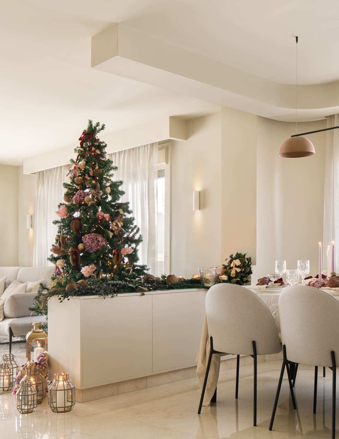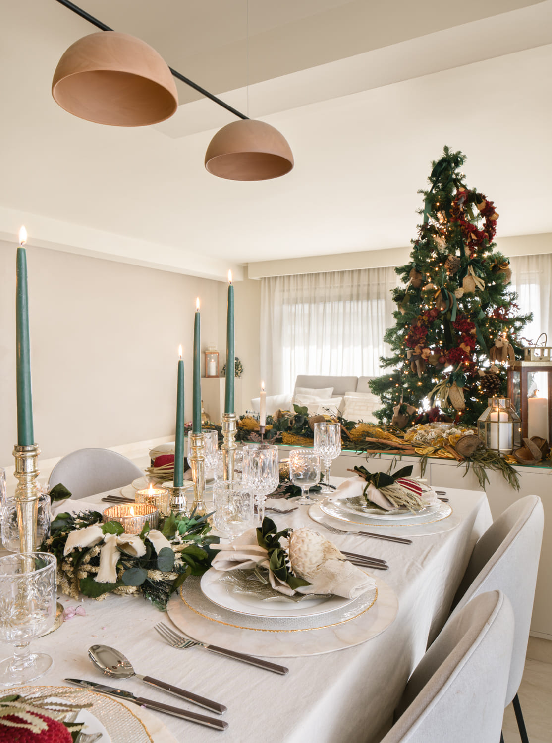 La segunda propuesta, más clásica y elegante, se construyó sobre verdes y dorados. Coronas en lino y hojas verdes, velas altas en verde, candelabros dorados y un árbol vestido en tonos rojos con coronas, flor y frutos de @deazulcobalto. Una composición atemporal que encaja de maravilla con la arquitectura suave y neutra de esta vivienda.