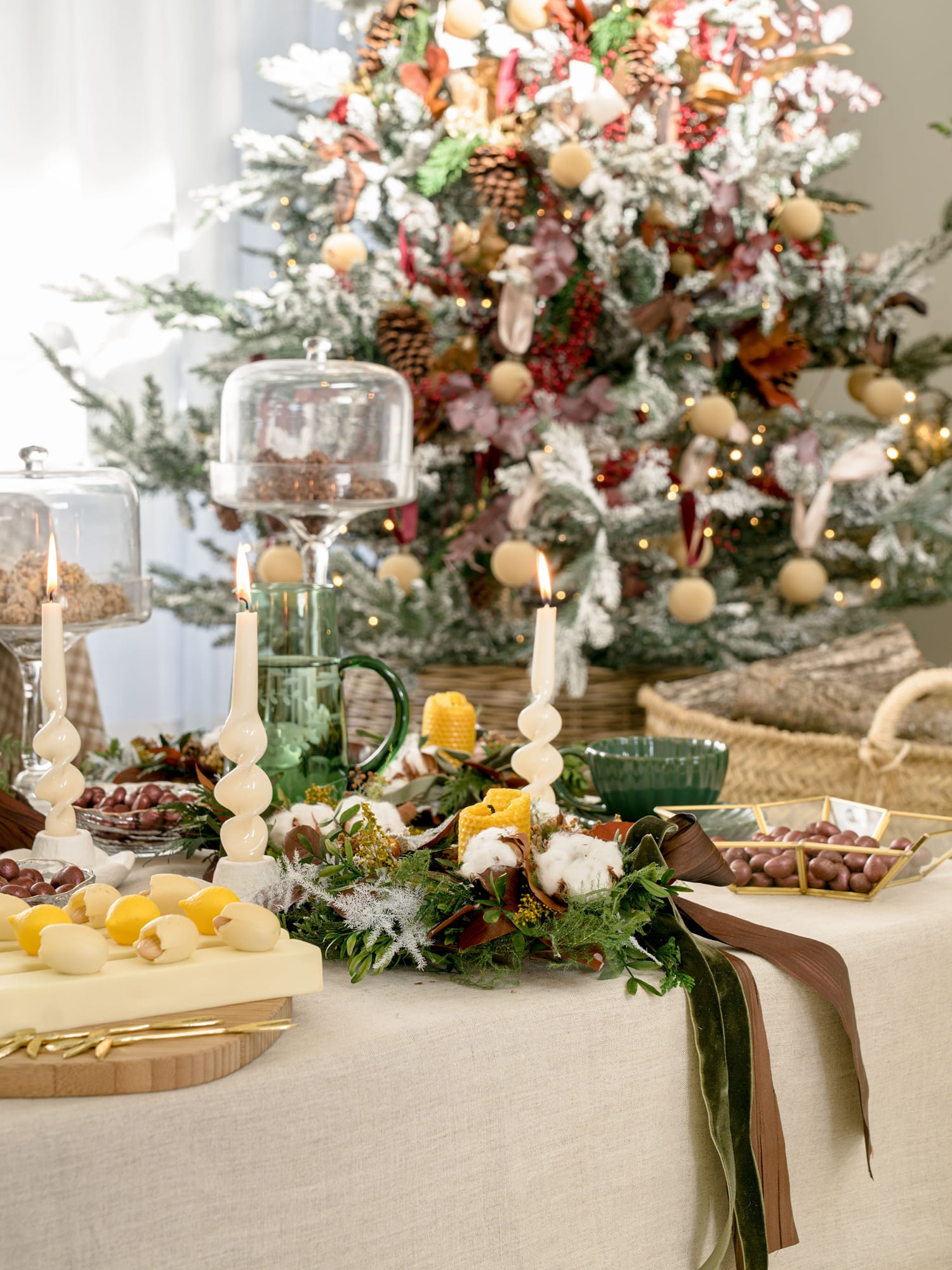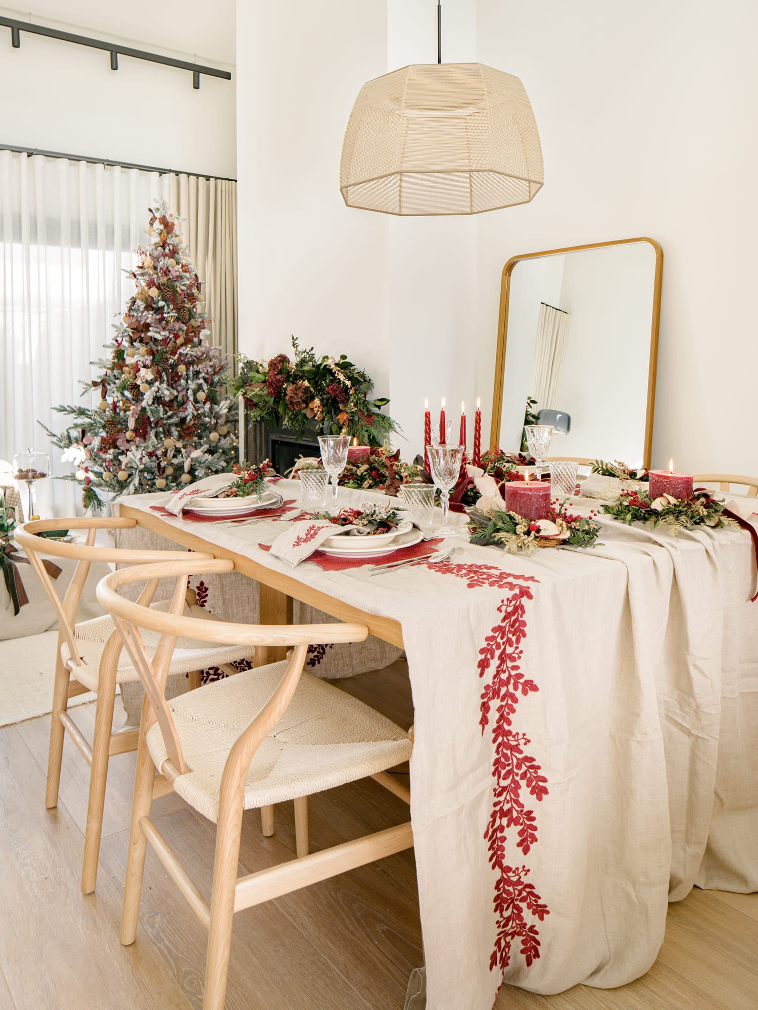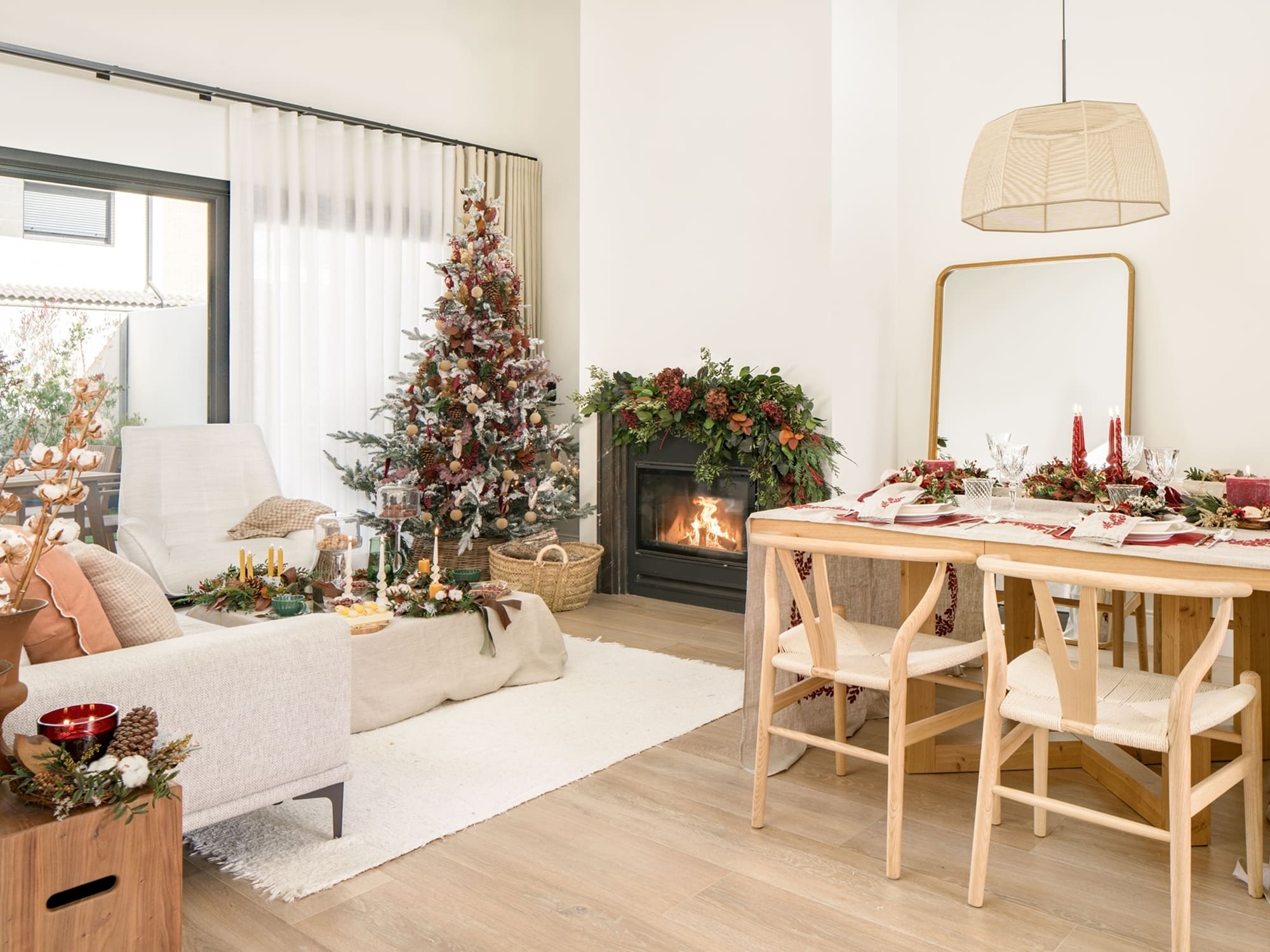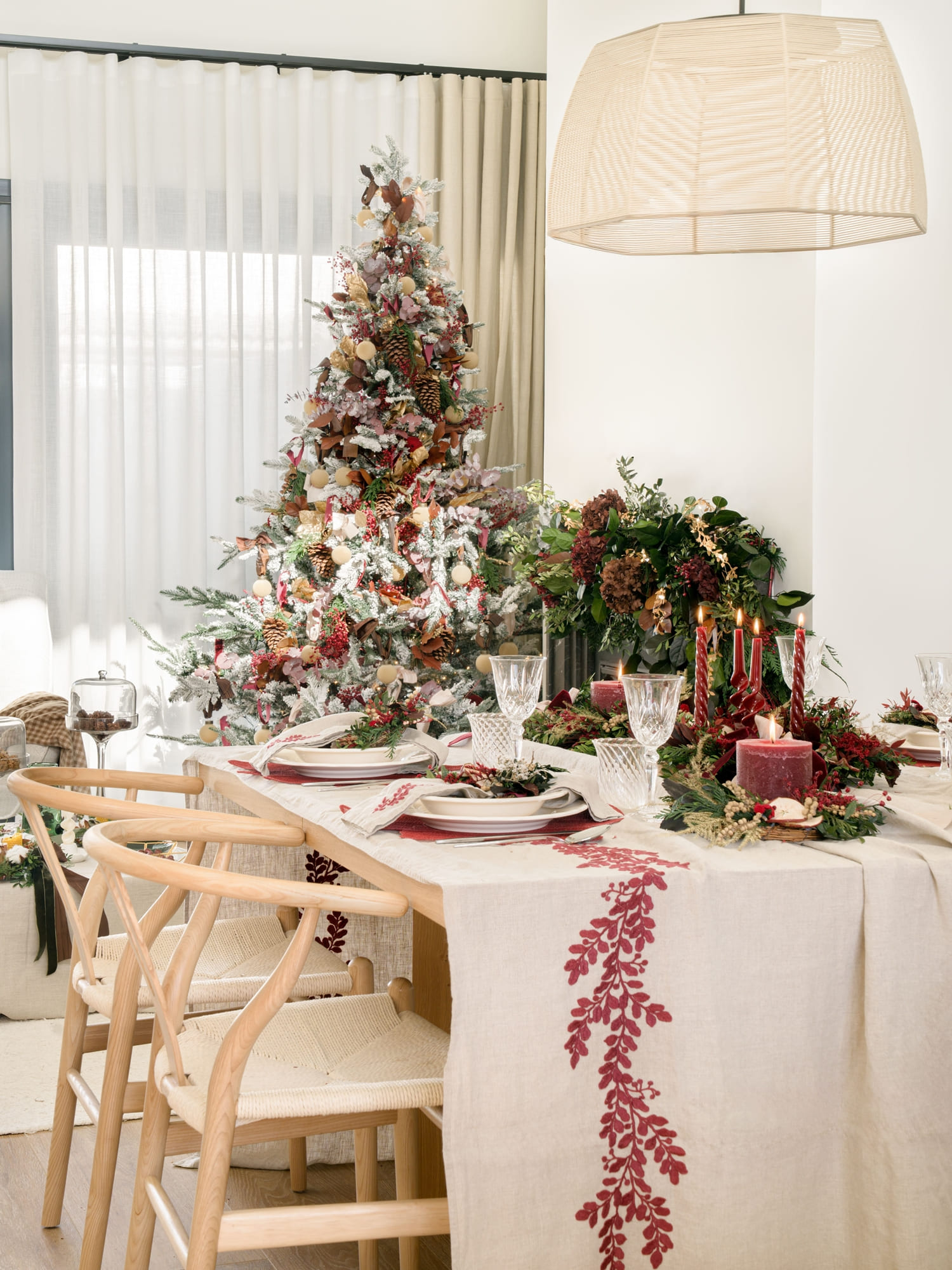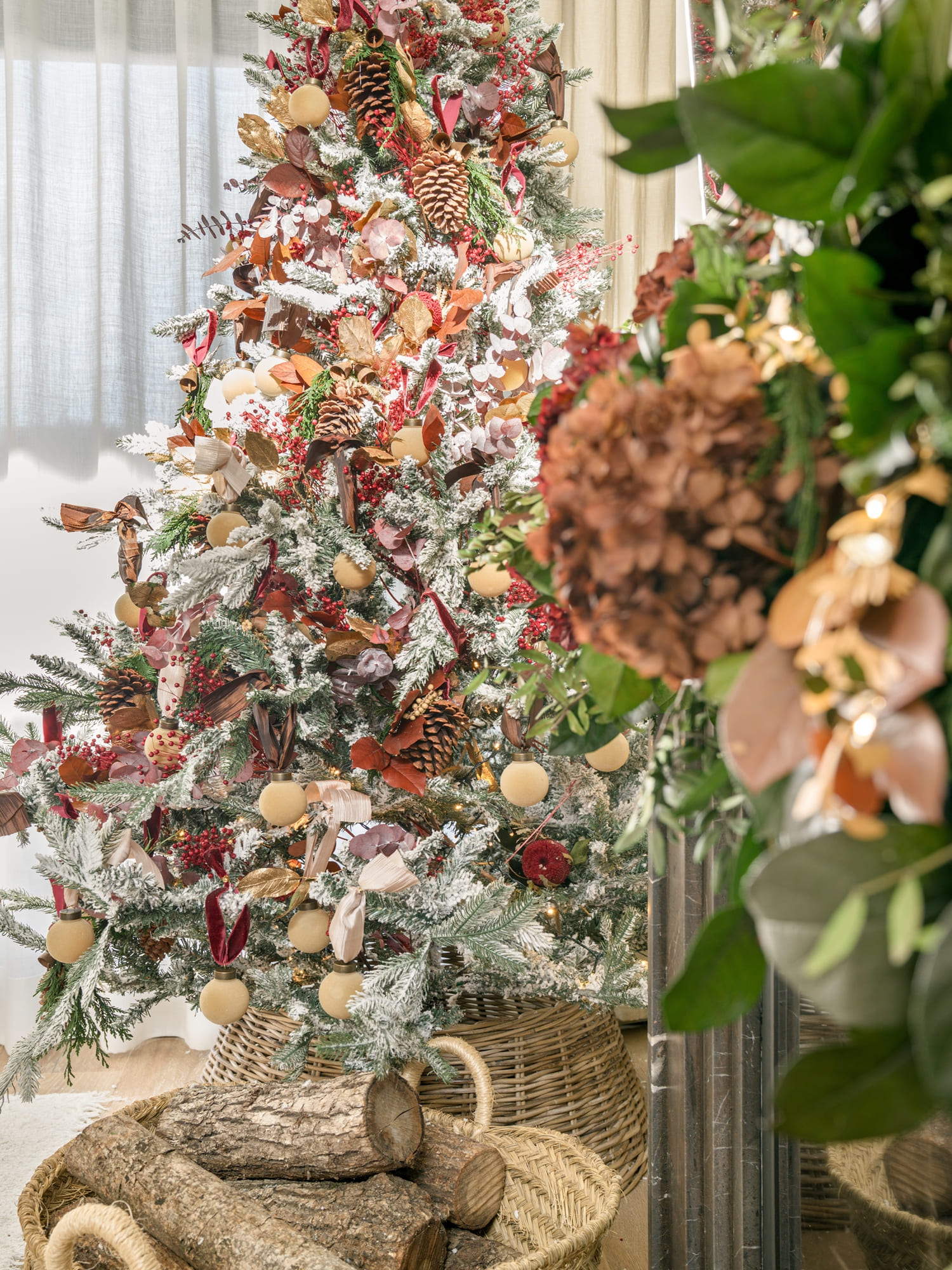 El árbol, vestido con bolas de terciopelo, piñas y ramas en tonos granates y marrones, continúa el relato natural de todo el espacio. Cada detalle está pensado para acompañar, no para irrumpir; para integrarse con la esencia de Oret House.