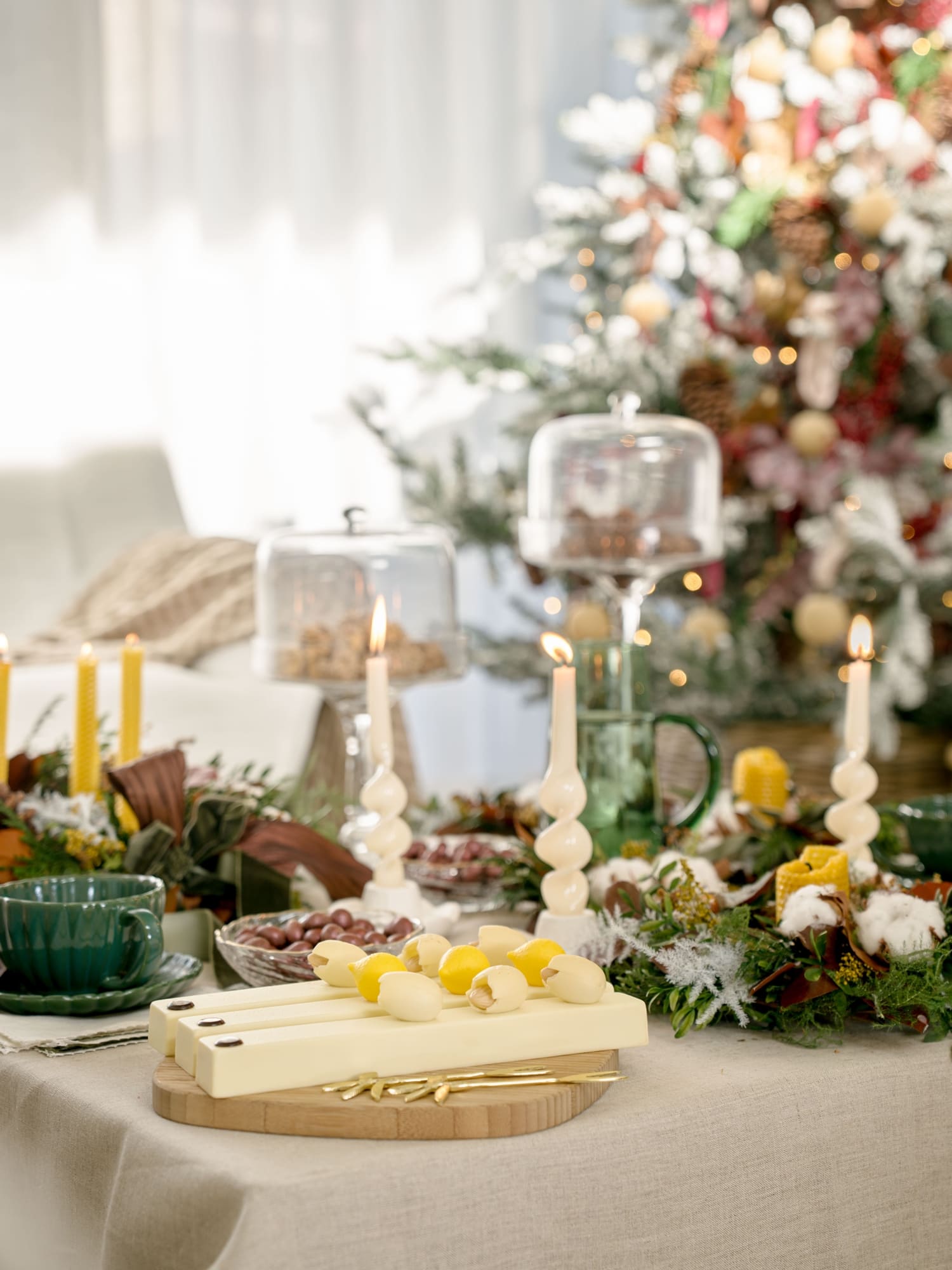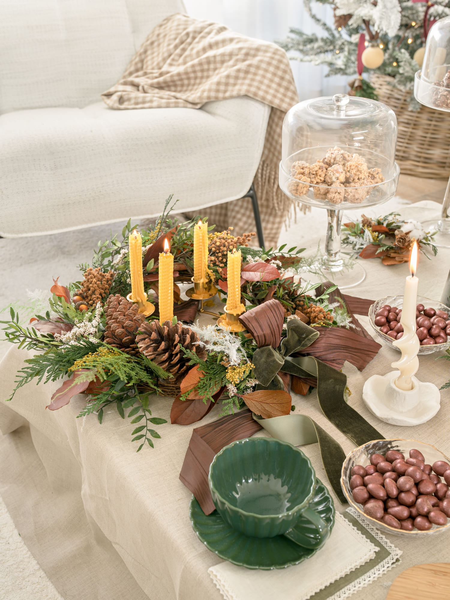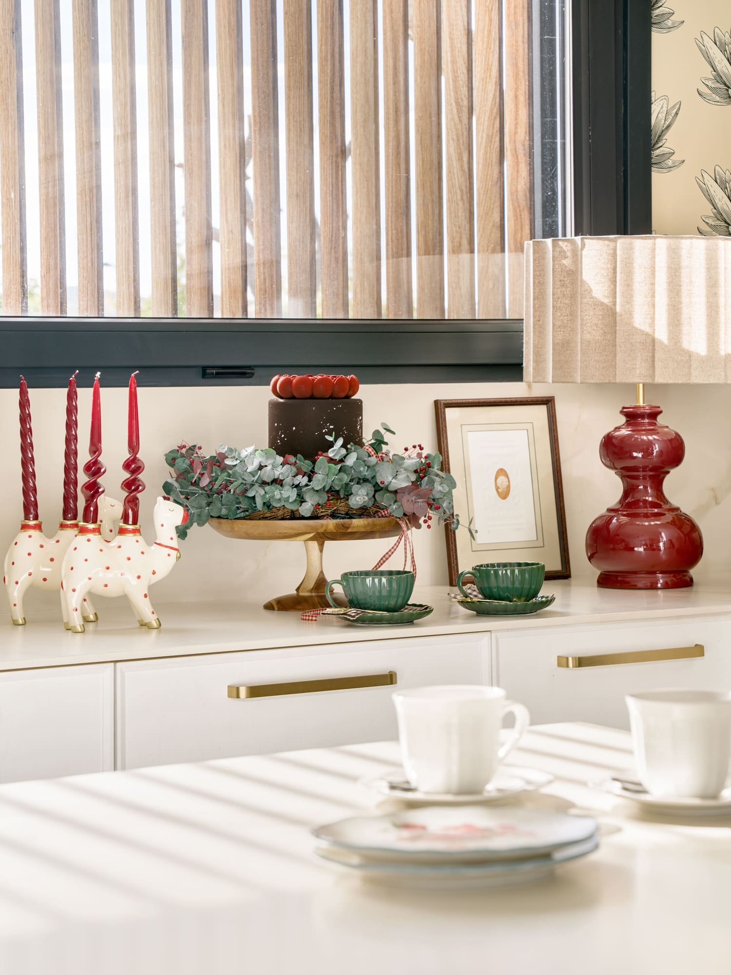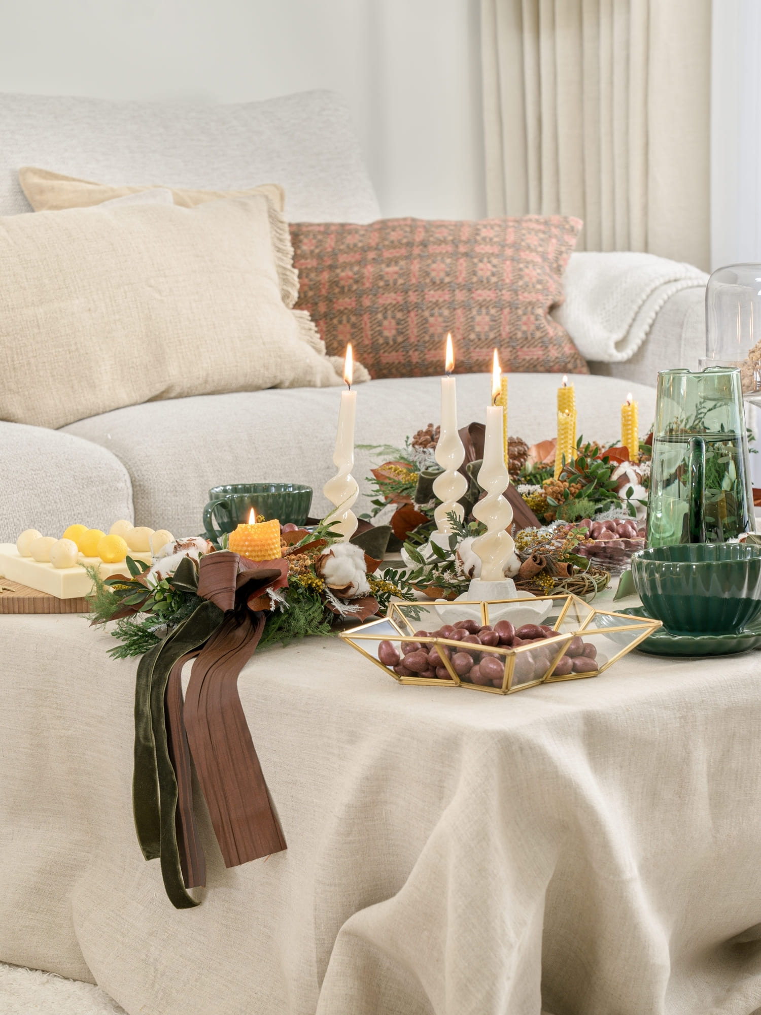 La mesa de comedor fue el punto de partida. Optamos por una paleta de verdes profundos y granates, acompañada de lino en tono piedra y detalles en terciopelo. Las coronas de D’azulcobalto, con doble lazo en gasa y terciopelo, aportan textura y movimiento. Las velas de Liderlamp y la cristalería labrada añaden ese matiz cálido y festivo que recuerda que la Navidad también ilumina desde los pequeños gestos.
