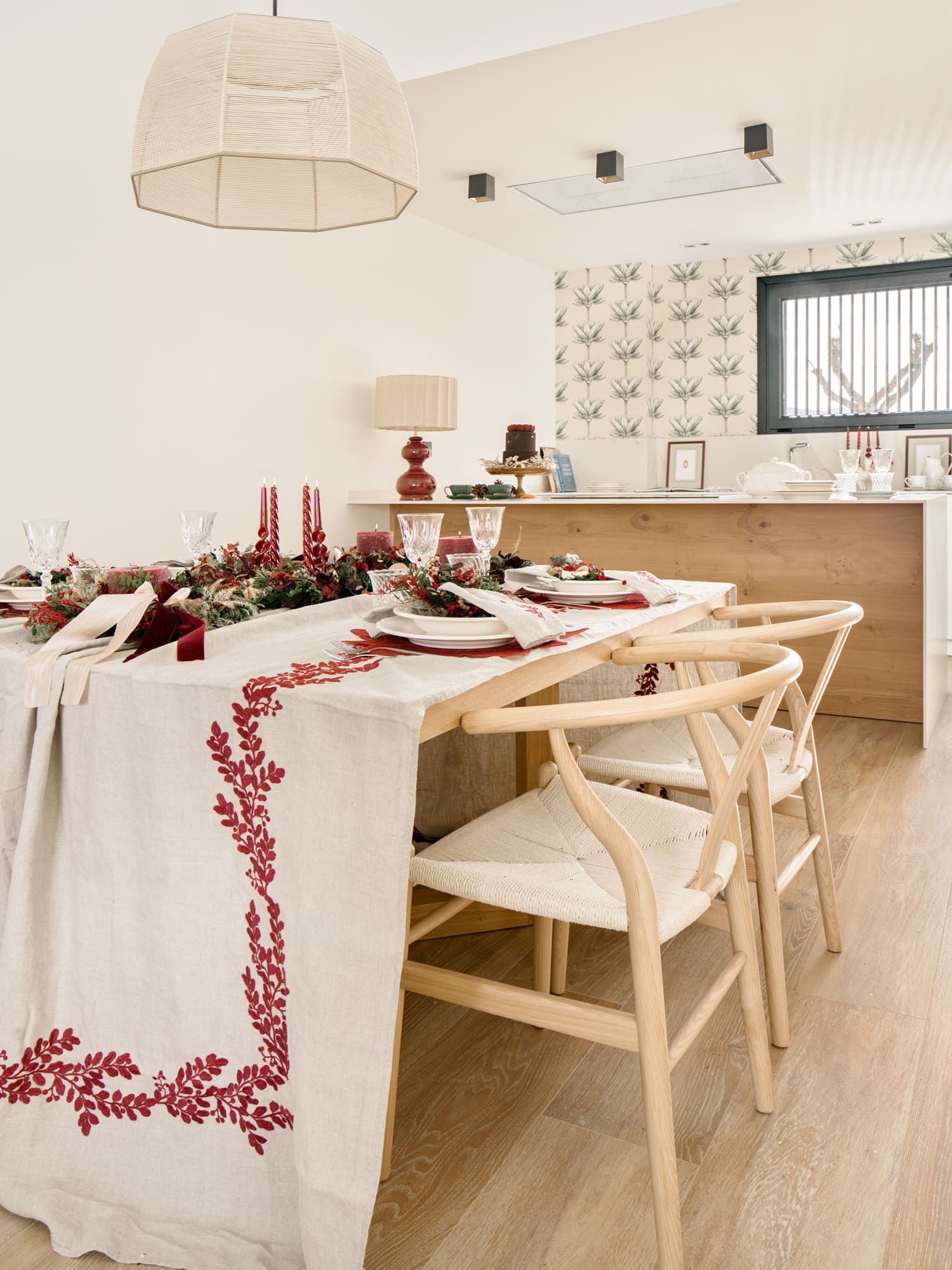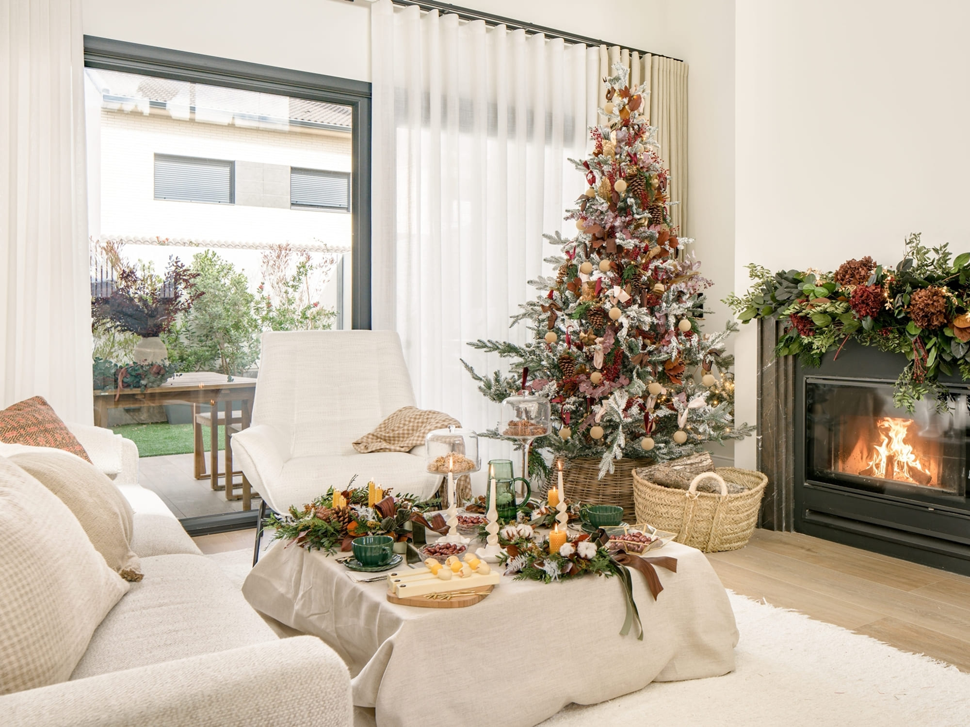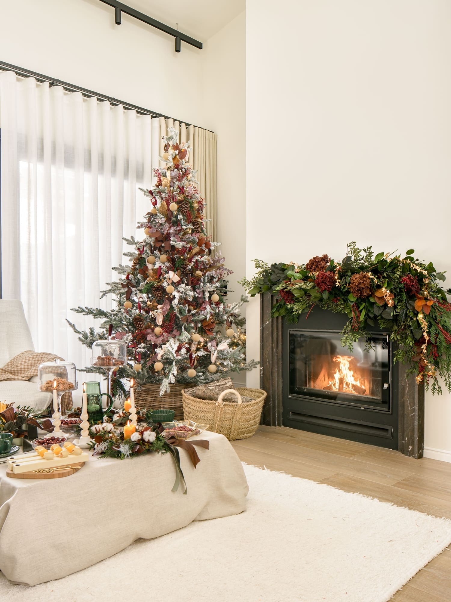La chimenea se convirtió en un segundo protagonista: una guirnalda frondosa en eucalipto, hortensia en tonos marrones y acebo enmarcó el fuego, mientras una guirnalda de luz aportaba ese brillo suave tan característico de estas fechas.