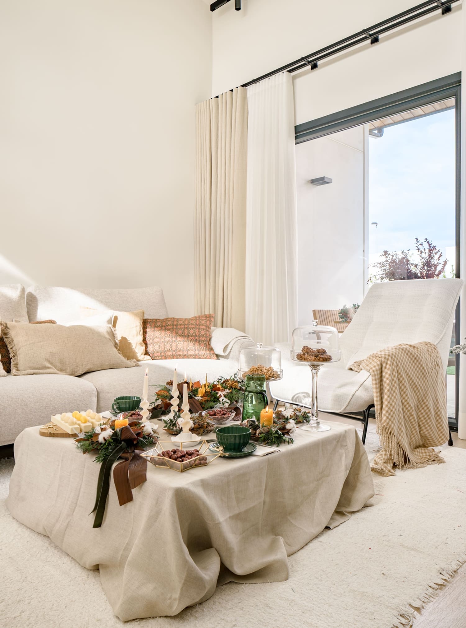 La mesa de centro se transformó en una mesa de postres con tonos tierra, mostaza y verdes suaves. Las composiciones florales de Paula —con piñas, mimosa, algodón y ramas preservadas— se combinaron con vajilla y candelabros de Liderlamp y los dulces artesanales de Raúl Bernal, creando un rincón íntimo que invita a detenerse y compartir.